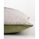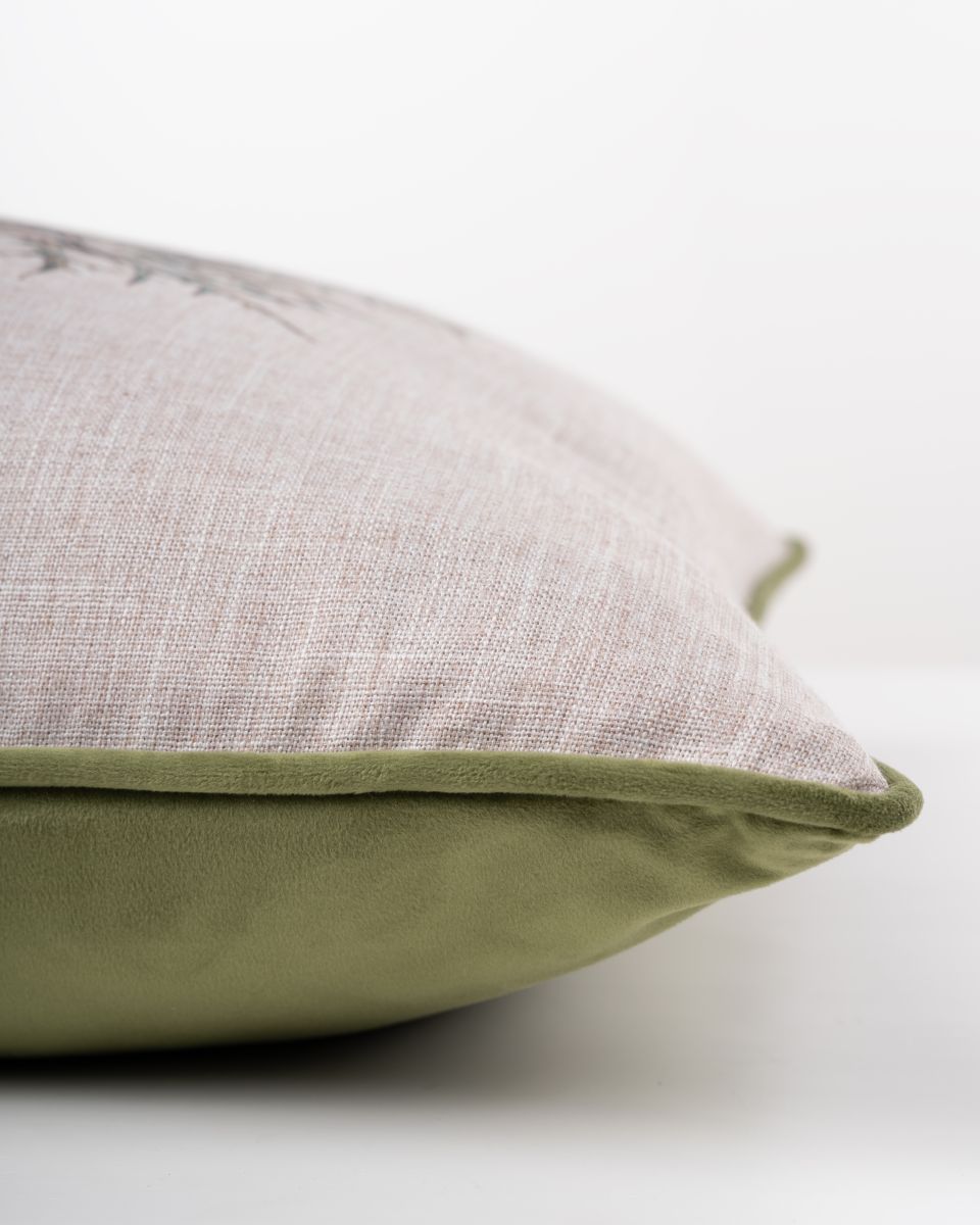 The cushion is finished with a plush velvet backing in a complementary moss green, adding warmth, softness, and luxurious texture. A piped edge frames the design for a tailored, high-end look, while the premium feather inner ensures exceptional comfort and a full, inviting silhouette.