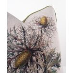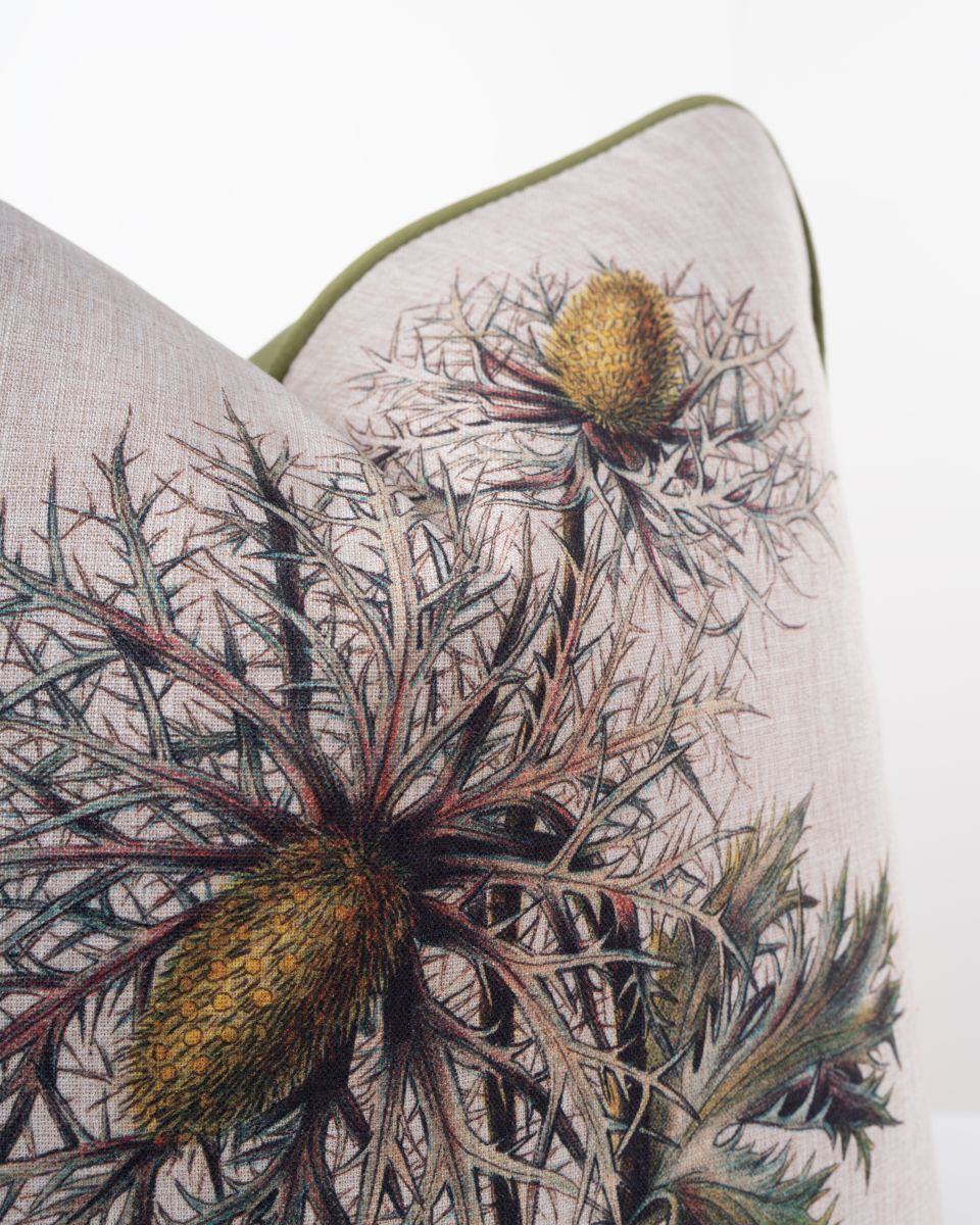 Bring natural artistry into your home with the Cocoon Flower Cushion, a beautifully detailed botanical accent inspired by vintage floral illustrations. The front features an intricate linen print showcasing cocoon-like blossoms surrounded by delicate, sprawling foliage. Rich earthy tones—gold, sage, deep green, and soft plum—create a striking yet organic palette that feels timeless and refined.