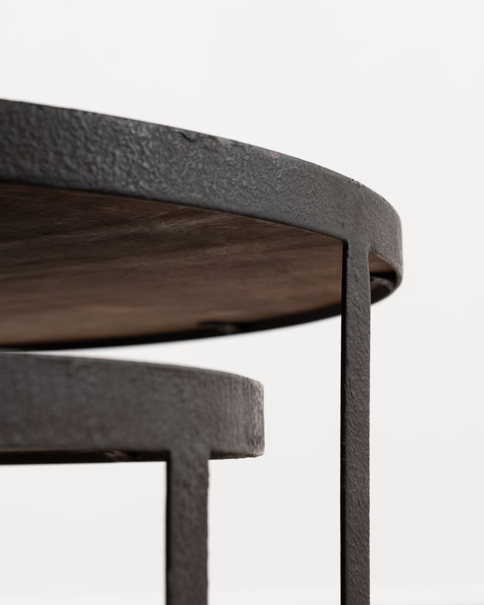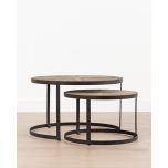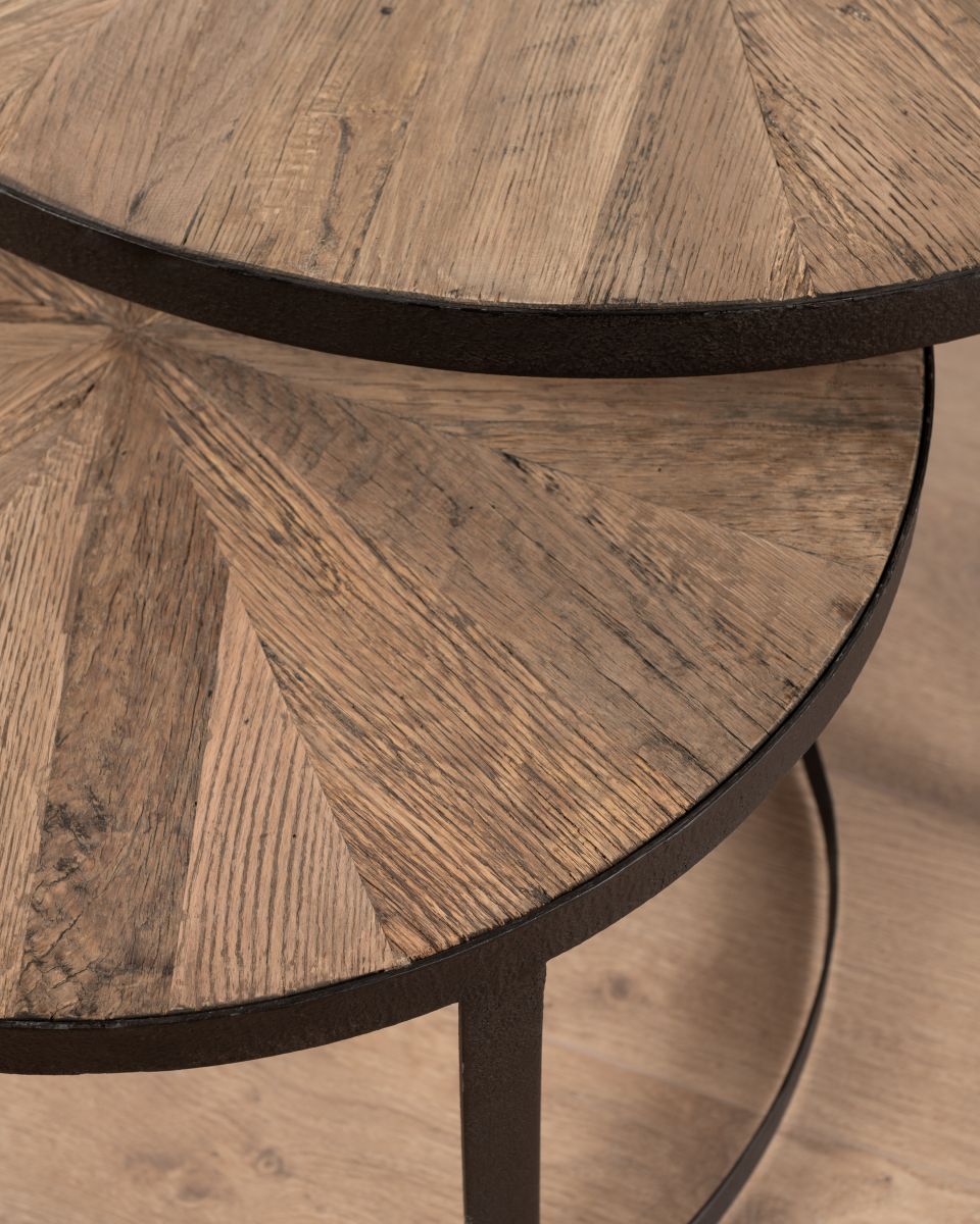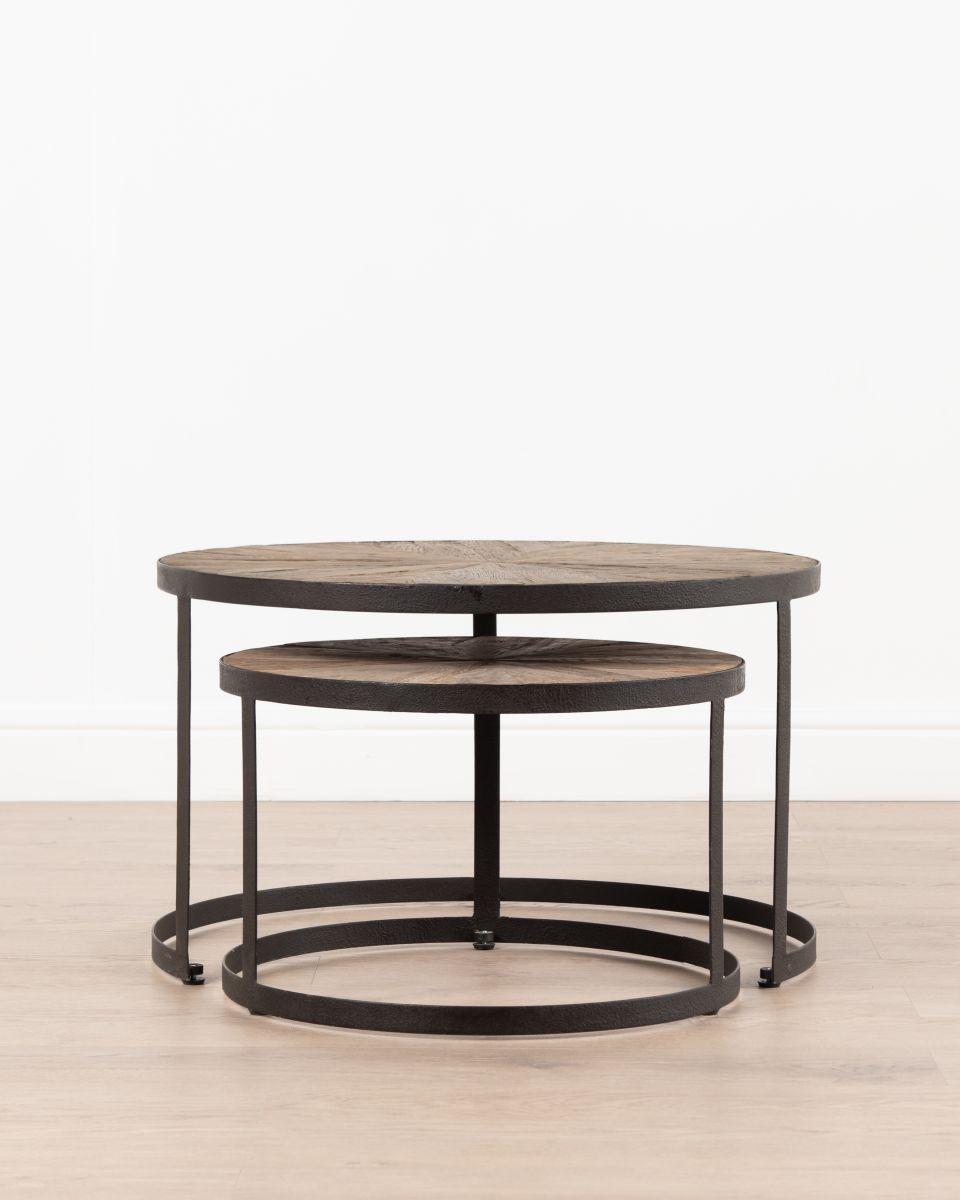 Transform your living space with our Thula nesting coffee tables from the Ebony Collection, featuring a chic black metal frame and the natural beauty of reclaimed oak surfaces.