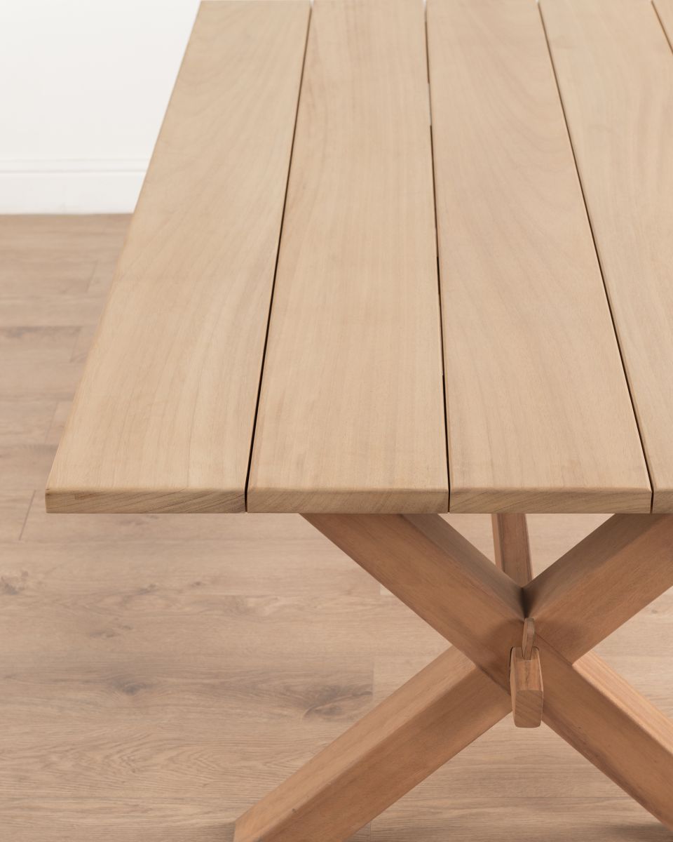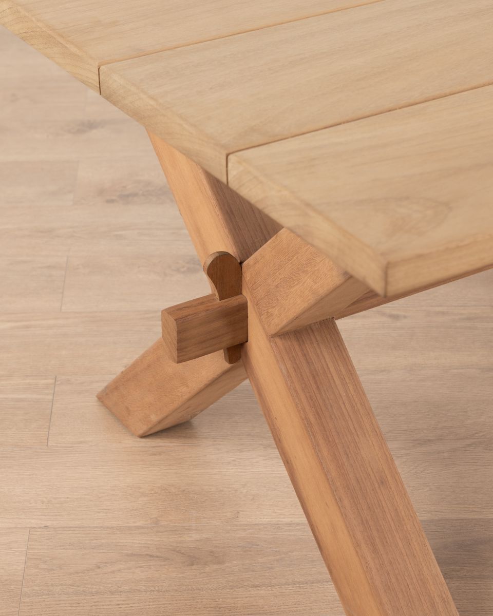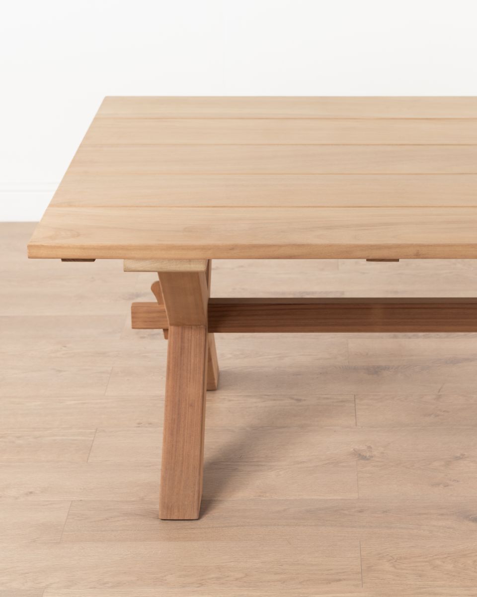 The table features a refined plank-style top and robust trestle-inspired legs, joined with traditional wooden pegs that highlight the craftsmanship behind every detail. Its natural finish enhances the rich grain and golden tones of Iroko, offering a versatile aesthetic that suits both contemporary and classic outdoor spaces.