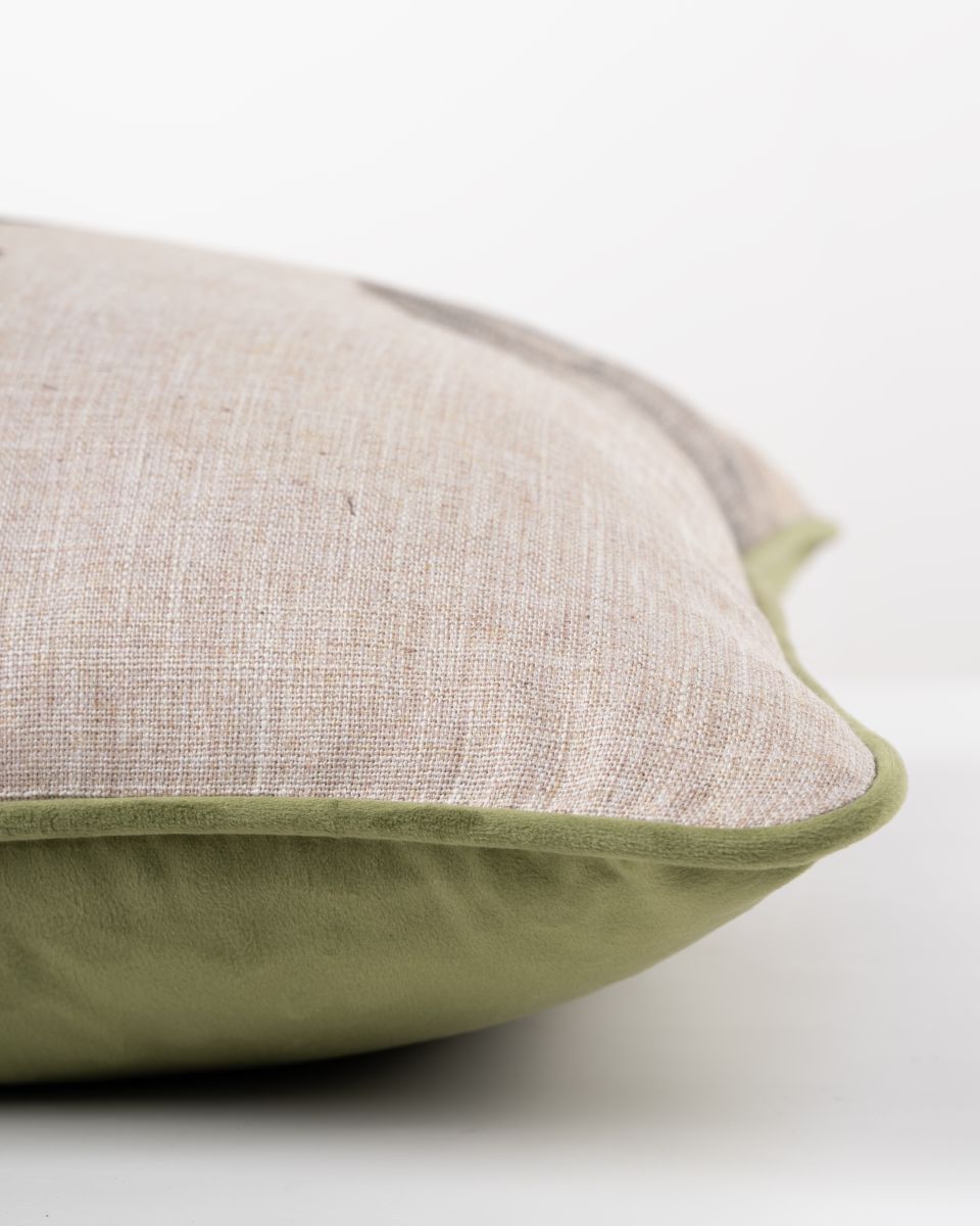 A plush velvet backing in a gentle moss green provides a luxurious contrast to the illustrated front, enhancing both texture and comfort. The piped edging offers a refined, tailored finish, while the premium feather inner ensures the cushion remains beautifully plump and inviting.
