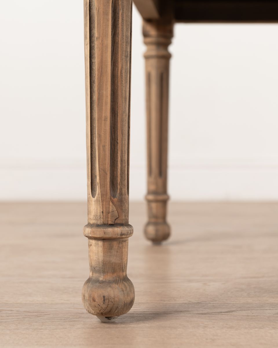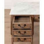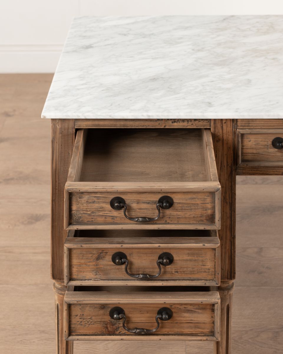 The Saint-Louis desk from the Château Collection features a white marble top and an aged pine finish for a perfect balance of luxury and rustic charm. Carved detailing and classic drawer handles enhance its timeless appeal, making it ideal as a desk or dressing table.