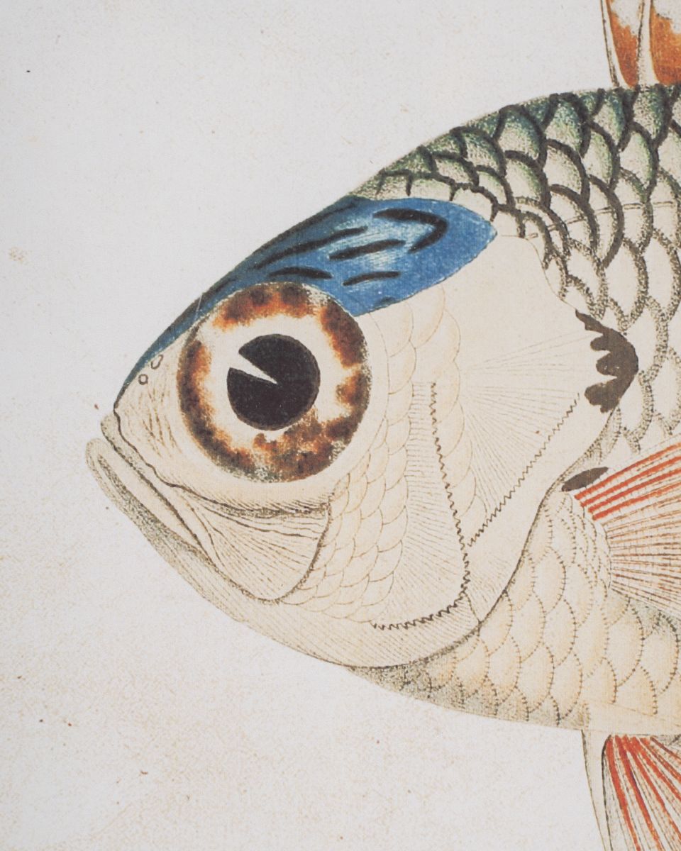 • Features a finely detailed illustration of a fish in soft tones with warm accents
