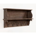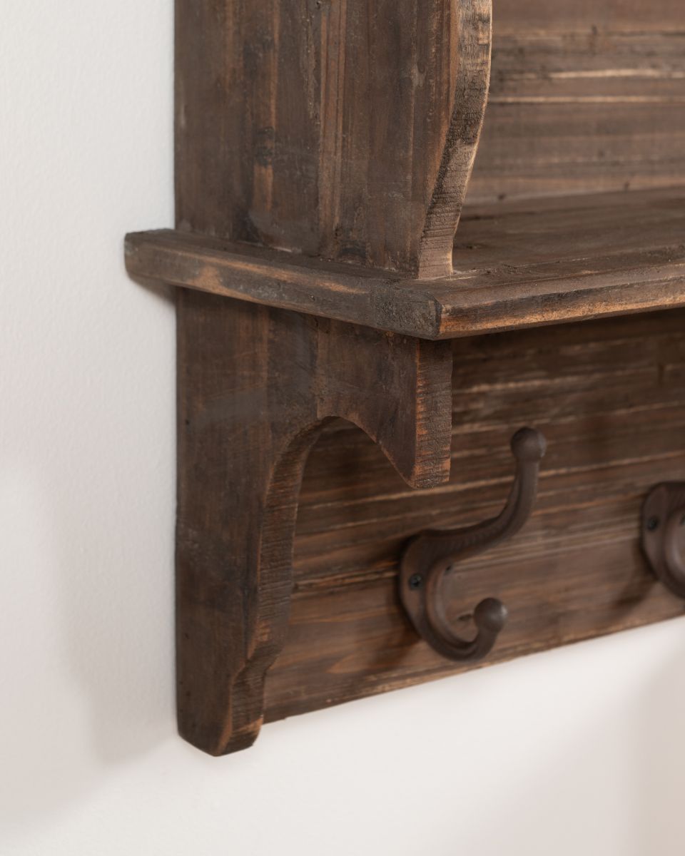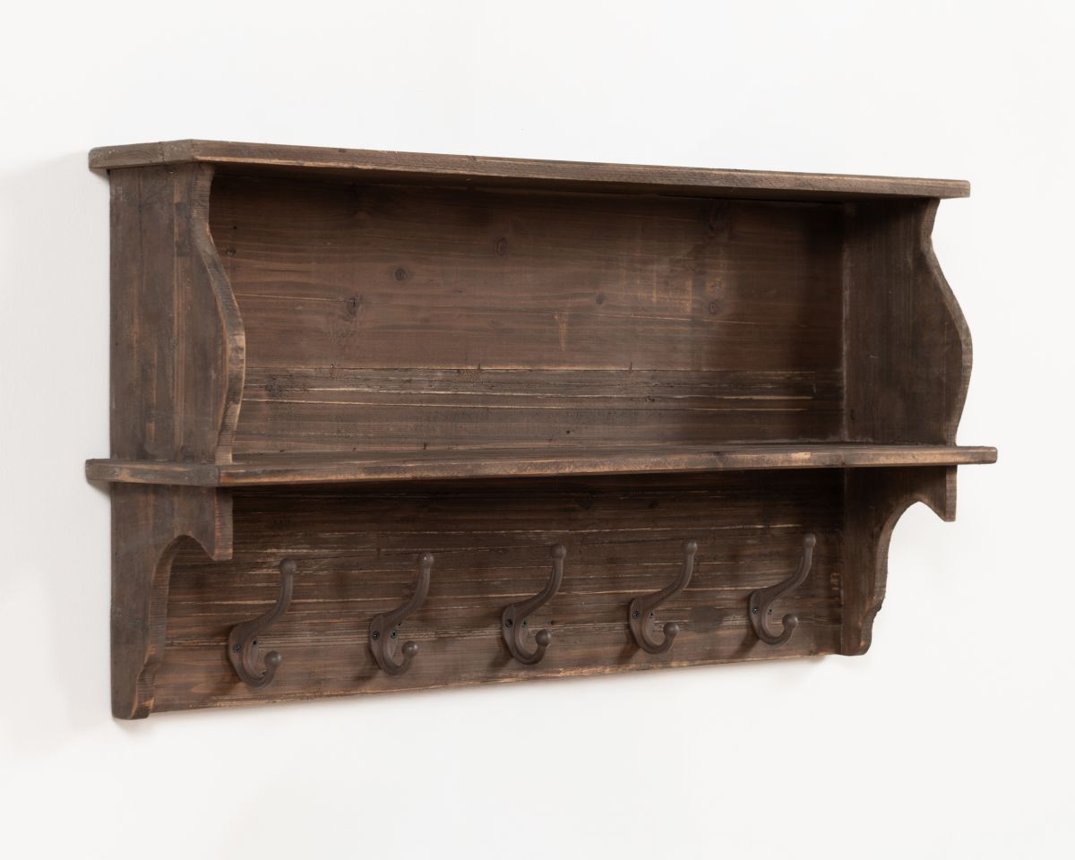 A row of sturdy cast-iron hooks provides generous hanging space for coats, hats, scarves, aprons, or bags, while the integrated top shelf adds extra room for displaying décor or storing household essentials. The combination of rugged metal hooks and warm, distressed wood makes this piece a versatile addition to entryways, kitchens, mudrooms, or bedrooms.