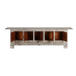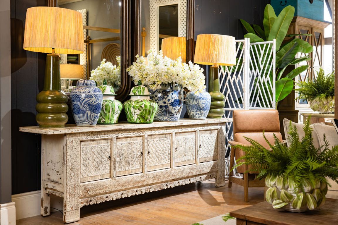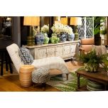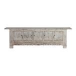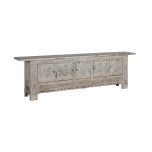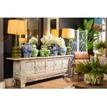 The Samira sideboard from our Indochine Range is crafted from pine wood and features a distressed paint finish. Its five doors are adorned with detailed carvings and metal ring handles.