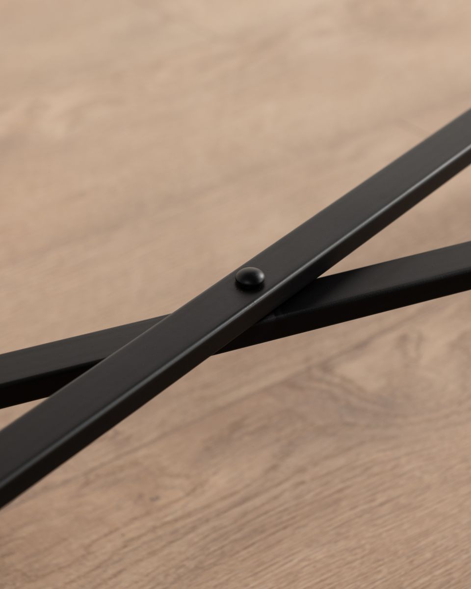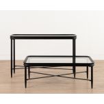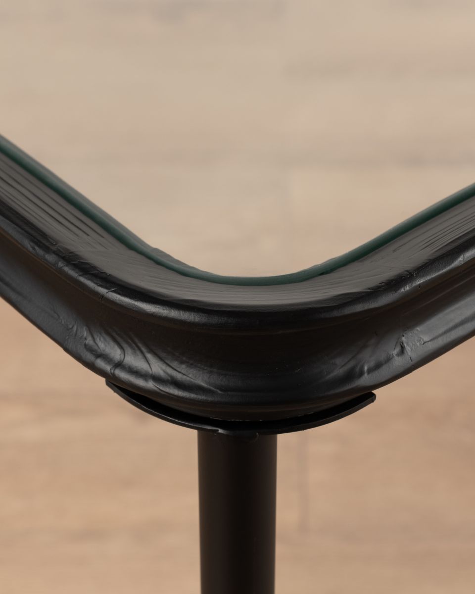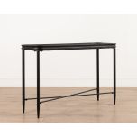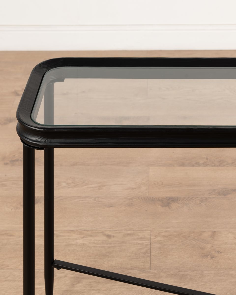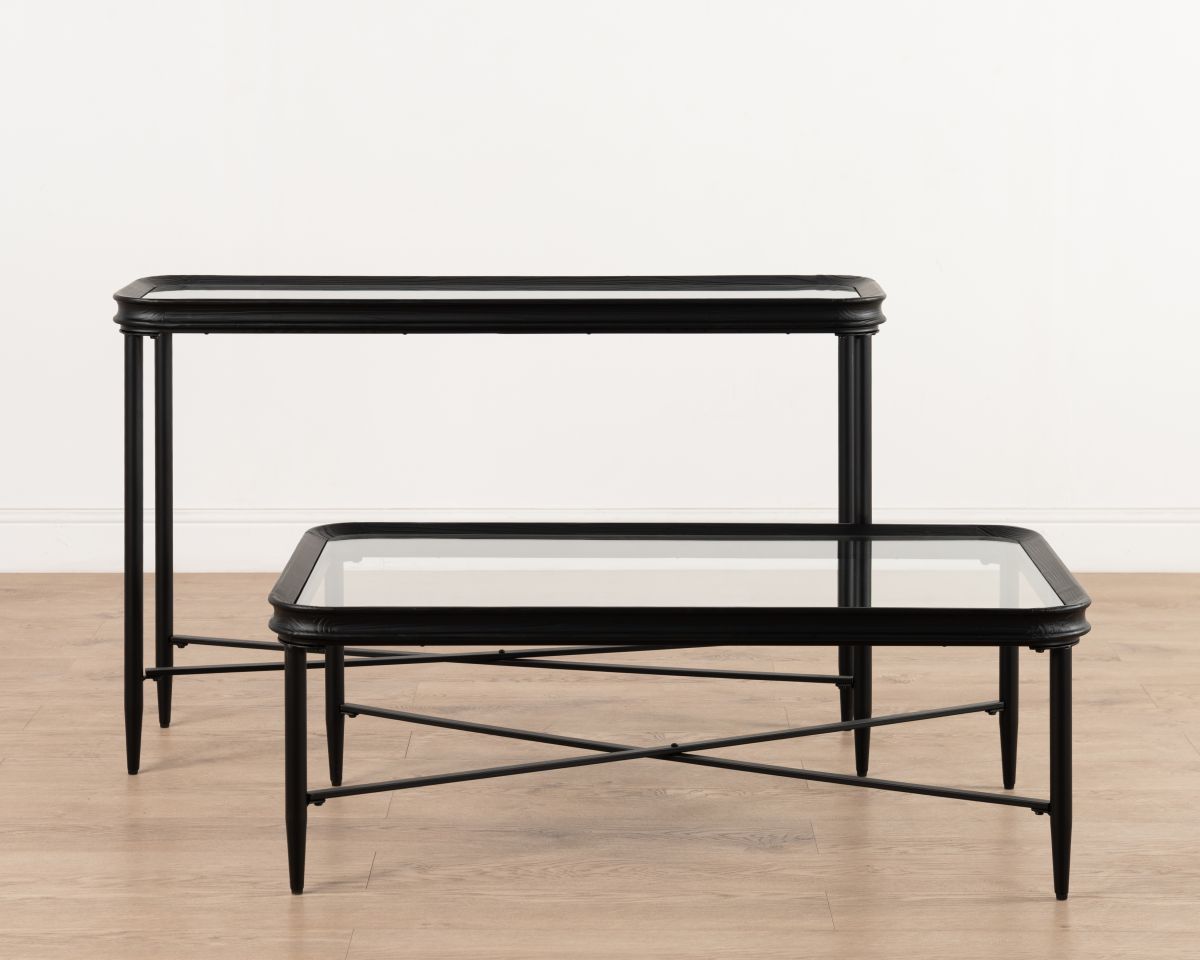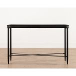 Part of the Ebony Collection, the Jengo Console Table combines bold simplicity with refined detailing. Its black-stained fir wood top features a glass insert, creating contrast and visual lightness against the slender iron legs.