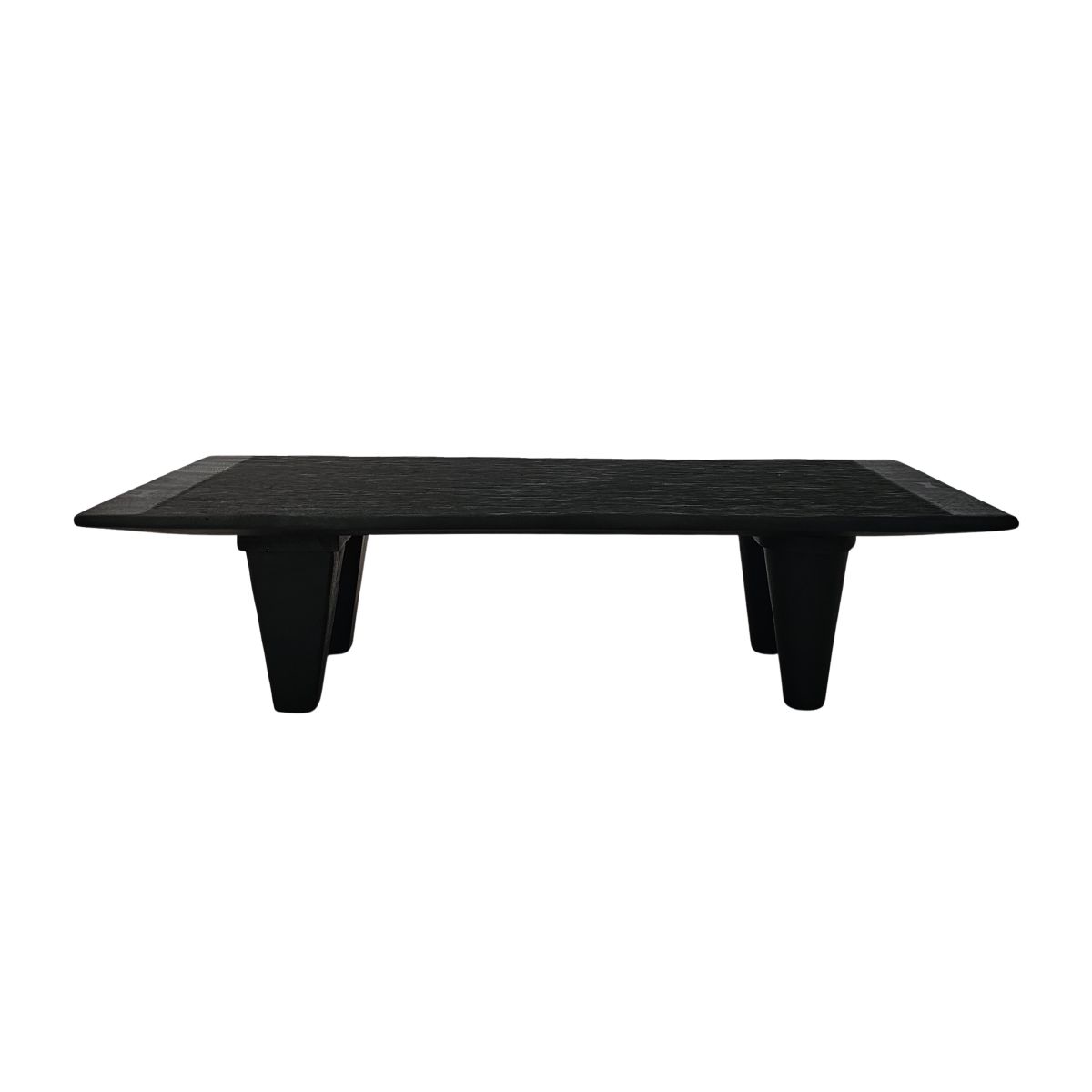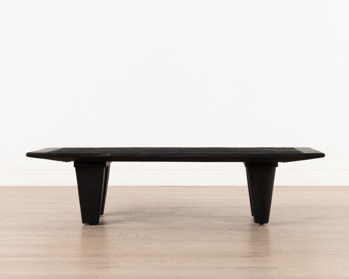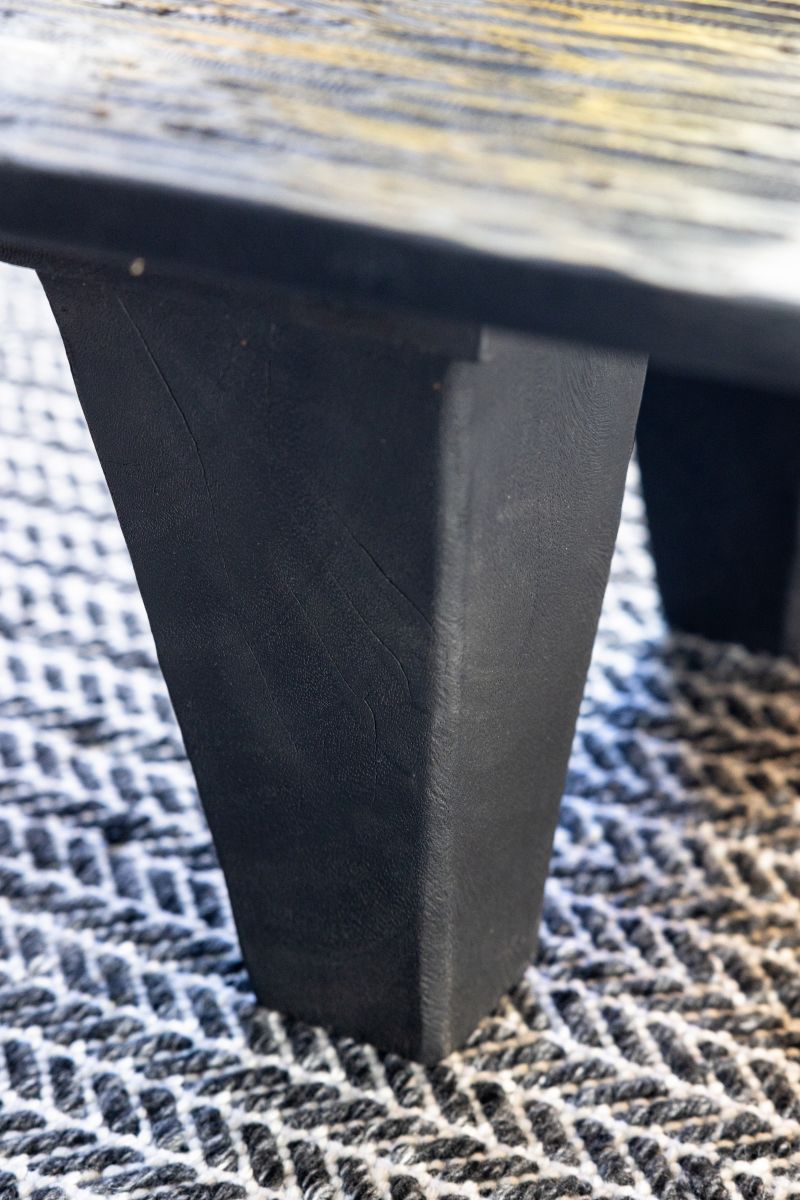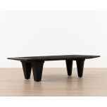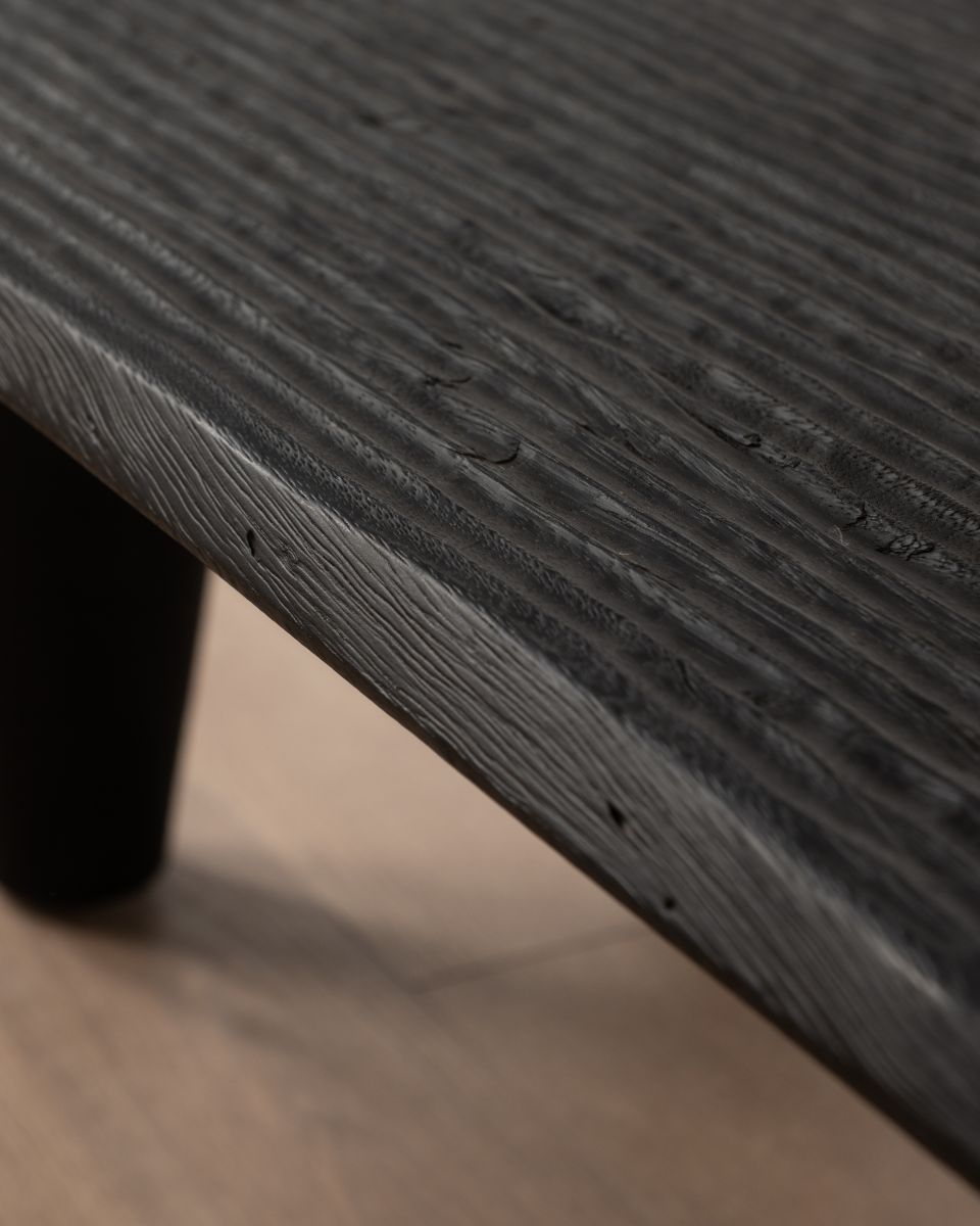- Features a broad, rectangular top with softly tapered edges, resting on sturdy, carved cone-shaped legs