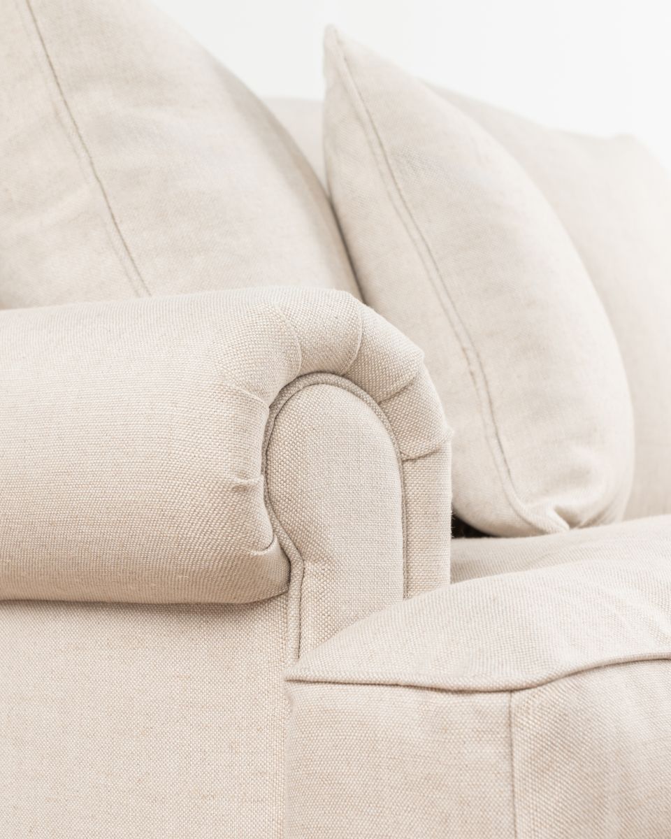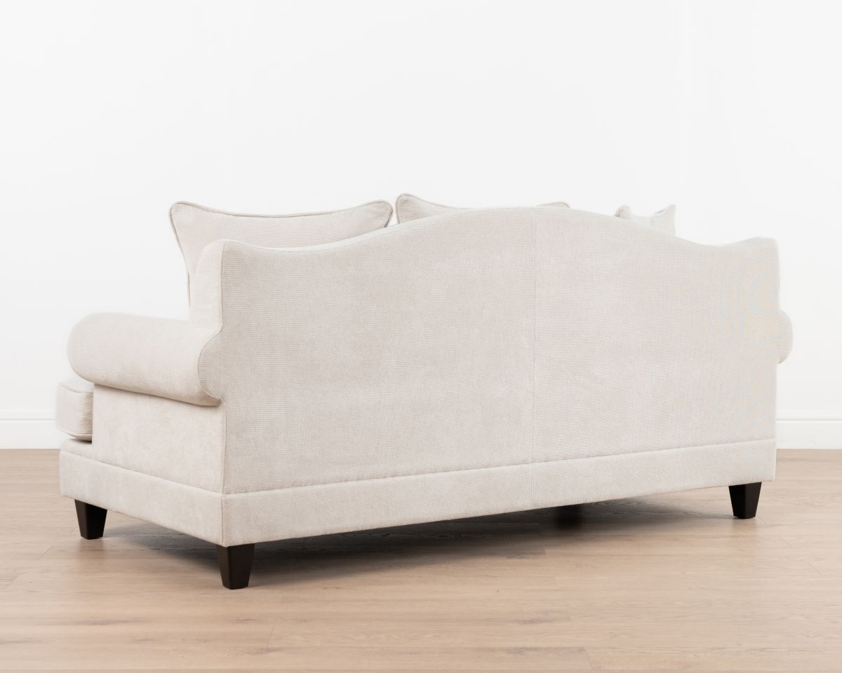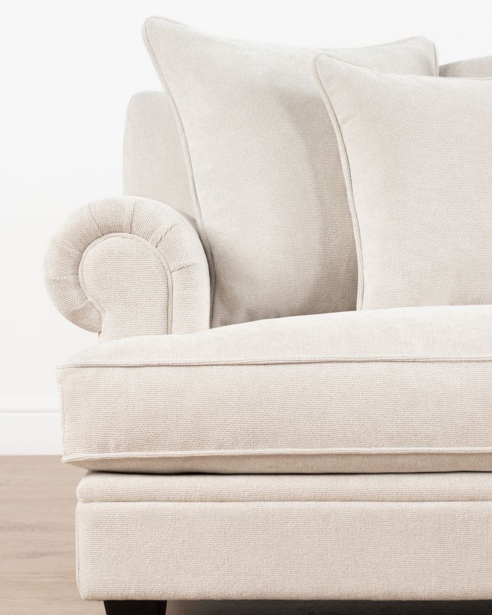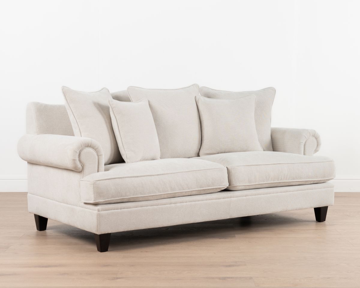 The Lucerne premium sofa is upholstered in luxury fabric and features a combination of low and high-density foam inners, topped with a feather layer for optimal comfort and durability. Designed with elegantly scrolled arms and a deep seat, this sofa is the perfect fusion of modern and classic. The generous cushions provide ample seating, while the durable construction ensures long-lasting support.