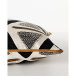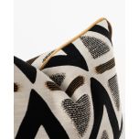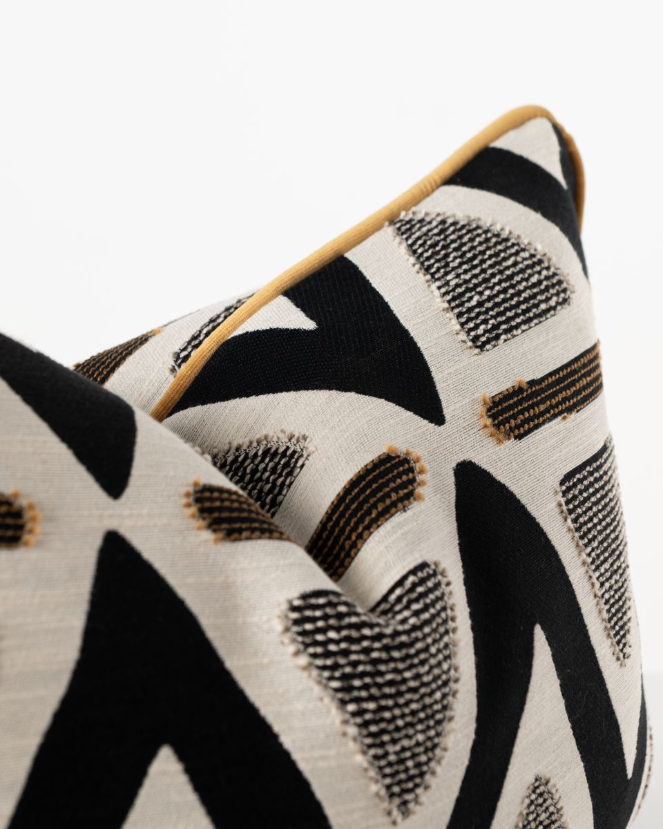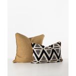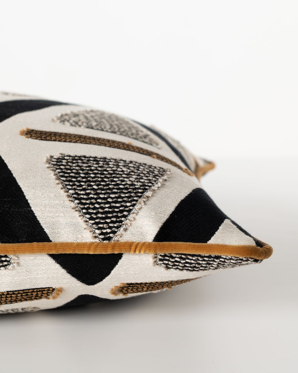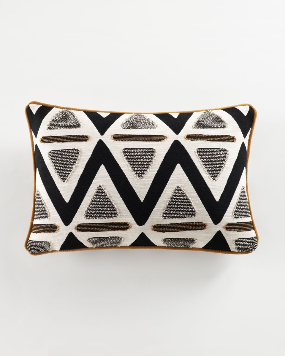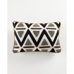A modern, graphic statement piece: the Mono Pyramid Rectangular Cushion. Featuring a series of sharp, black chevrons and textured grey triangles and horizontal brown lines, it brings energy and structure to any setting. Made from a cotton-rich fabric blend with acrylic, polyester and linen added for extra softness and durability, it's an ideal accent piece that's designed to last. Its piped edge trim gives the piece a crisp, tailored finish that balances out the organic feel. Ideal for layering with other cushions in solid, neutral colours, this piece adds visual interest, depth and texture.