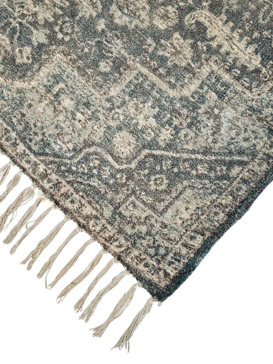 The Agra Rug from our Naksha Range features muted patterns in earthy tones and tasselled edges. Made of chenille, it evokes a vintage look while allowing its traditional influences to shine. It's perfect for adding warmth and texture to your space.