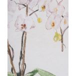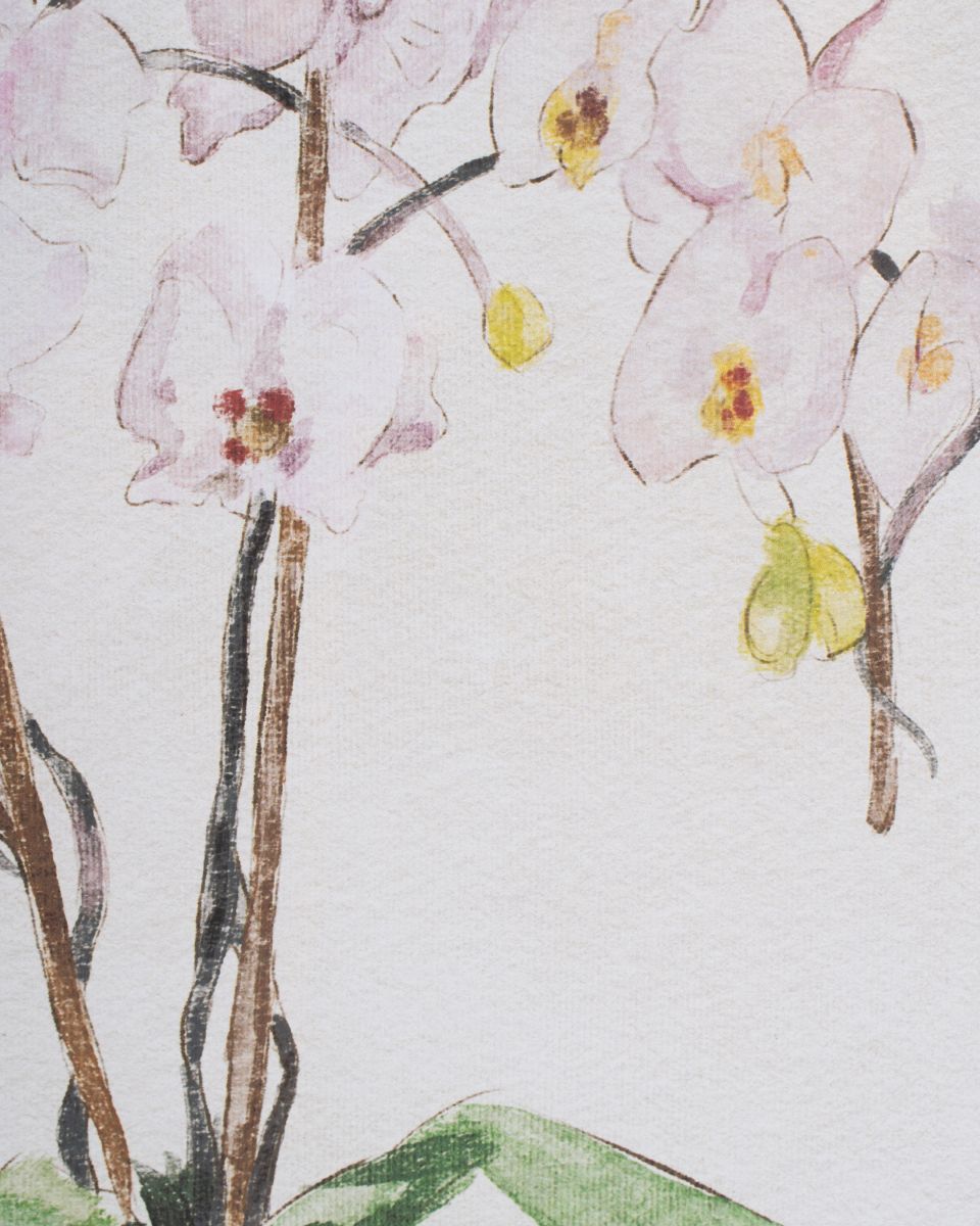 - Features an elegant watercolour-style illustration of delicate white orchids in a chinoiserie-inspired vase