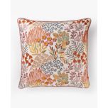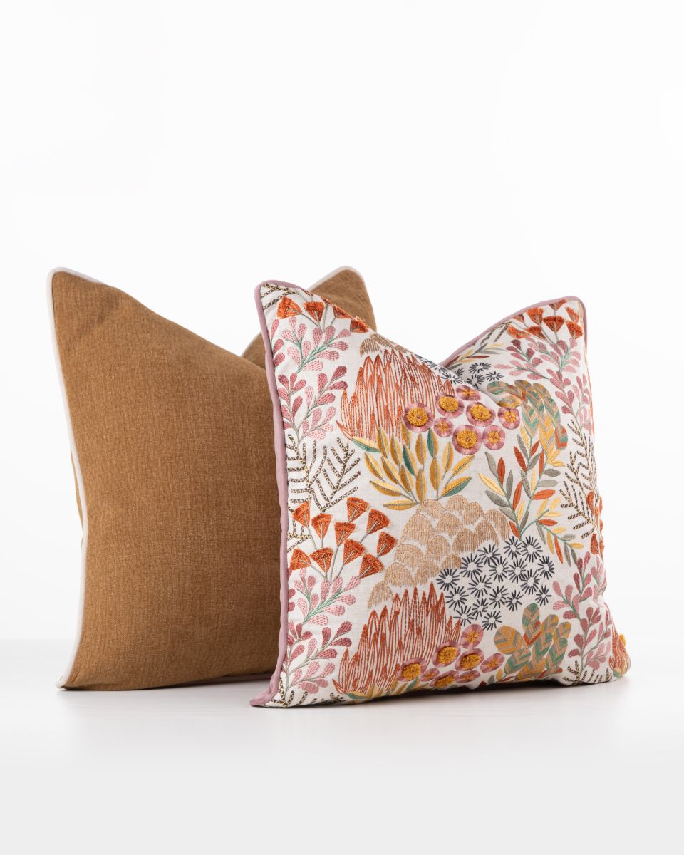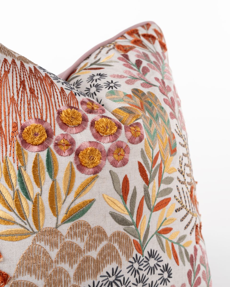 The linen front panel showcases an intricate embroidered landscape of stylised blooms, foliage and organic patterns in warm rose tones, soft pinks, deep oranges and touches of gold and green. The richly textured embroidery adds depth and dimension, making this cushion as much a decorative artwork as it is a functional accent.