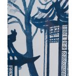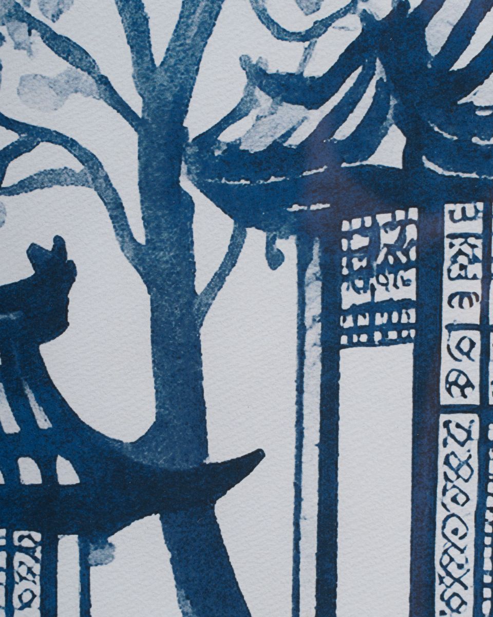 - Features a detailed illustration of two striking blue pagodas set amongst trees and lush foliage