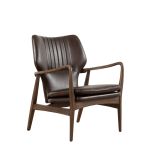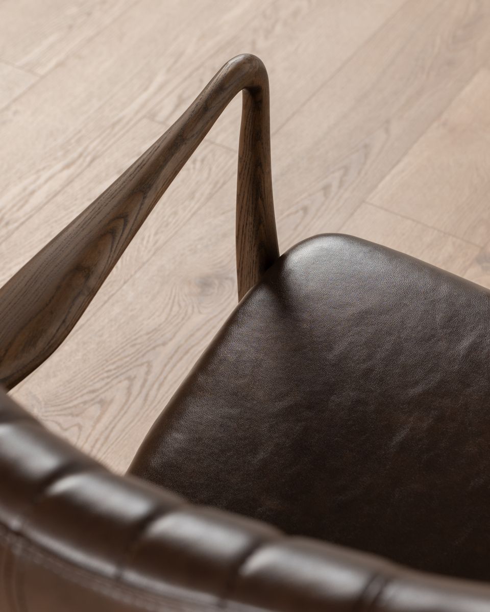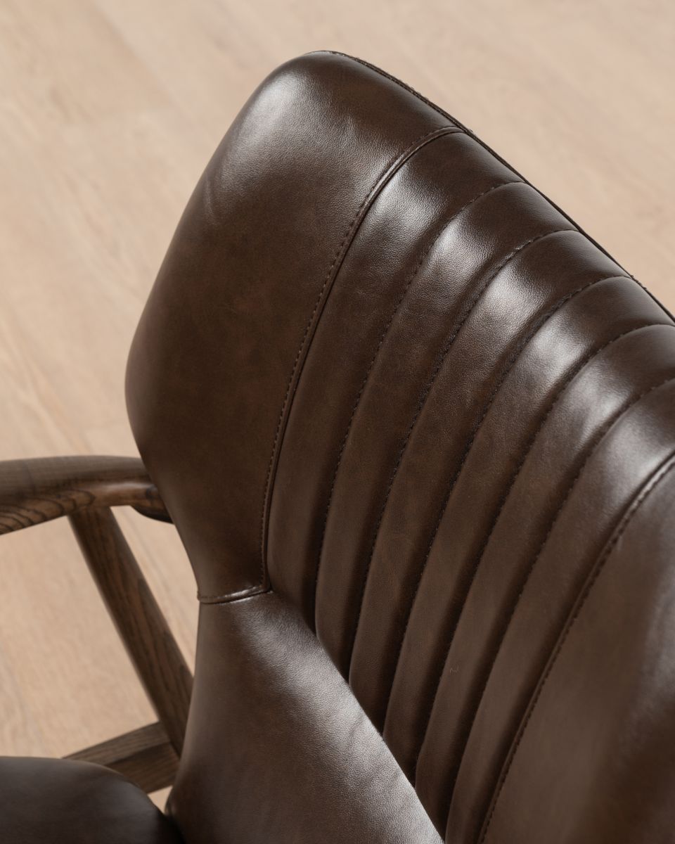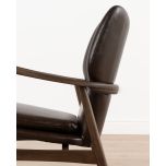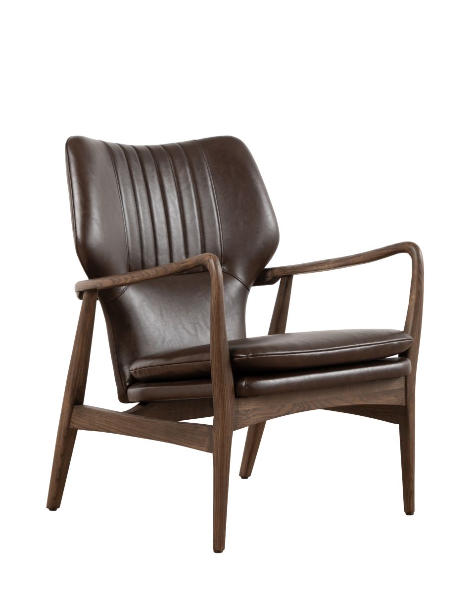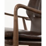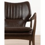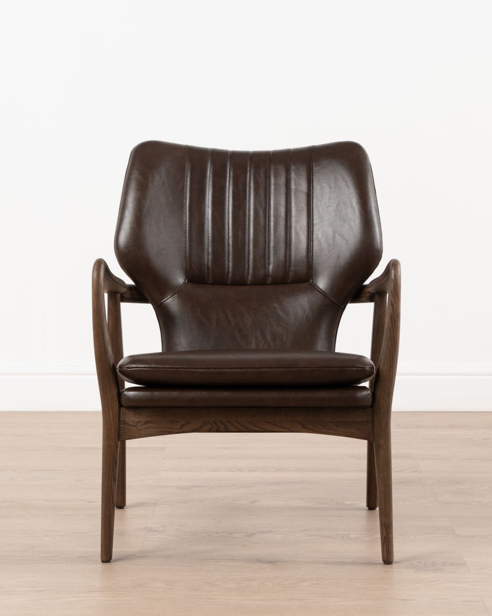 - Features gently curved arms, tapered legs, and a high, contoured backrest