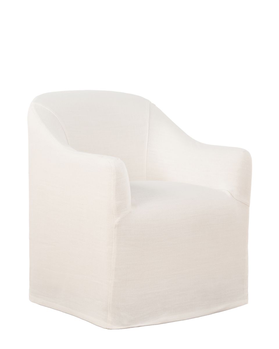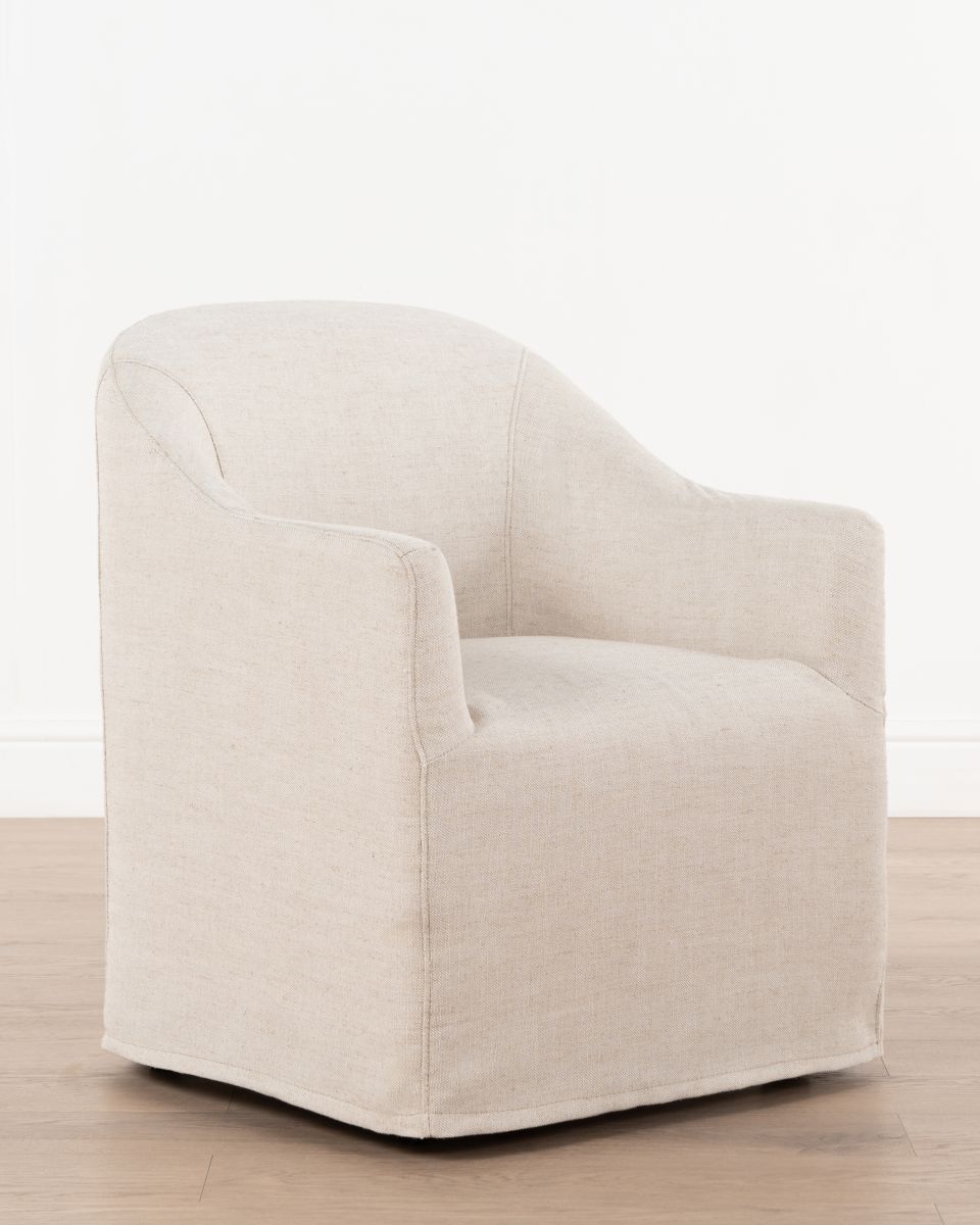 Our Remington chair features a soft, enveloping design with gently curved arms and a comfortable, cushioned seat. The slipcover gives it a relaxed, casual feel while still maintaining a sophisticated and polished look, making it a versatile addition to various interior decor styles.