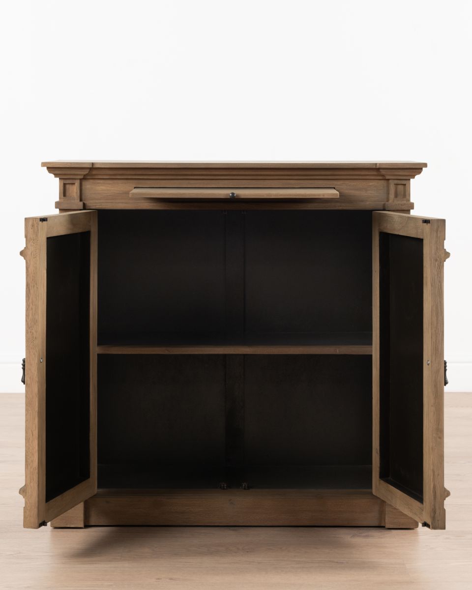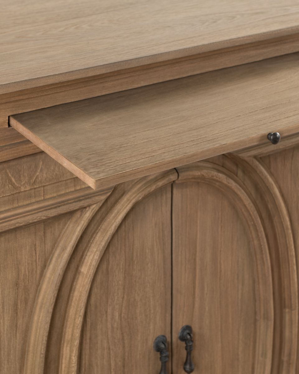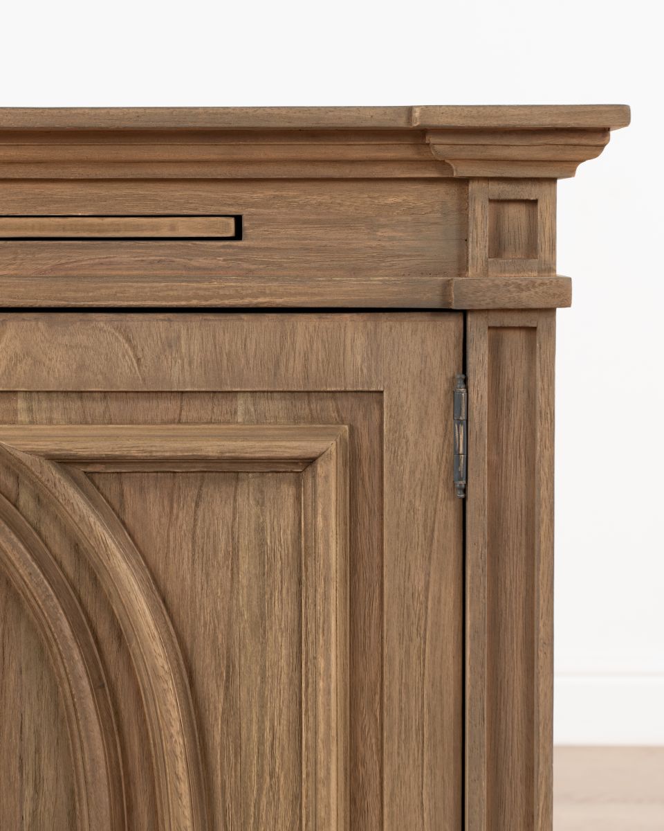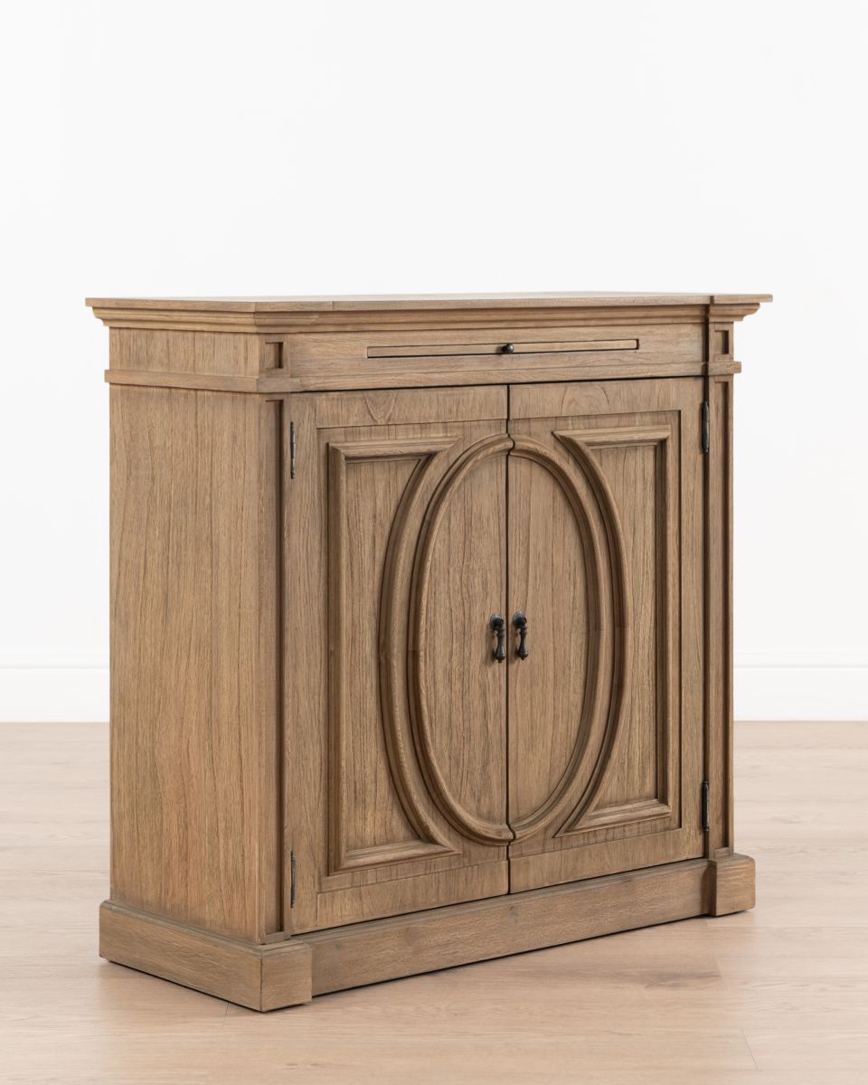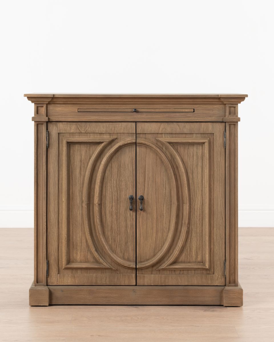 The Rennes cabinet from the Chateau collection is a lovely narrow piece brimming with classic French style. Its curved top complements the elegant wood finish of the painted base. Crafted from bayur wood with a mindi veneer, this versatile cabinet can grace either side of a fireplace with mirrors above.