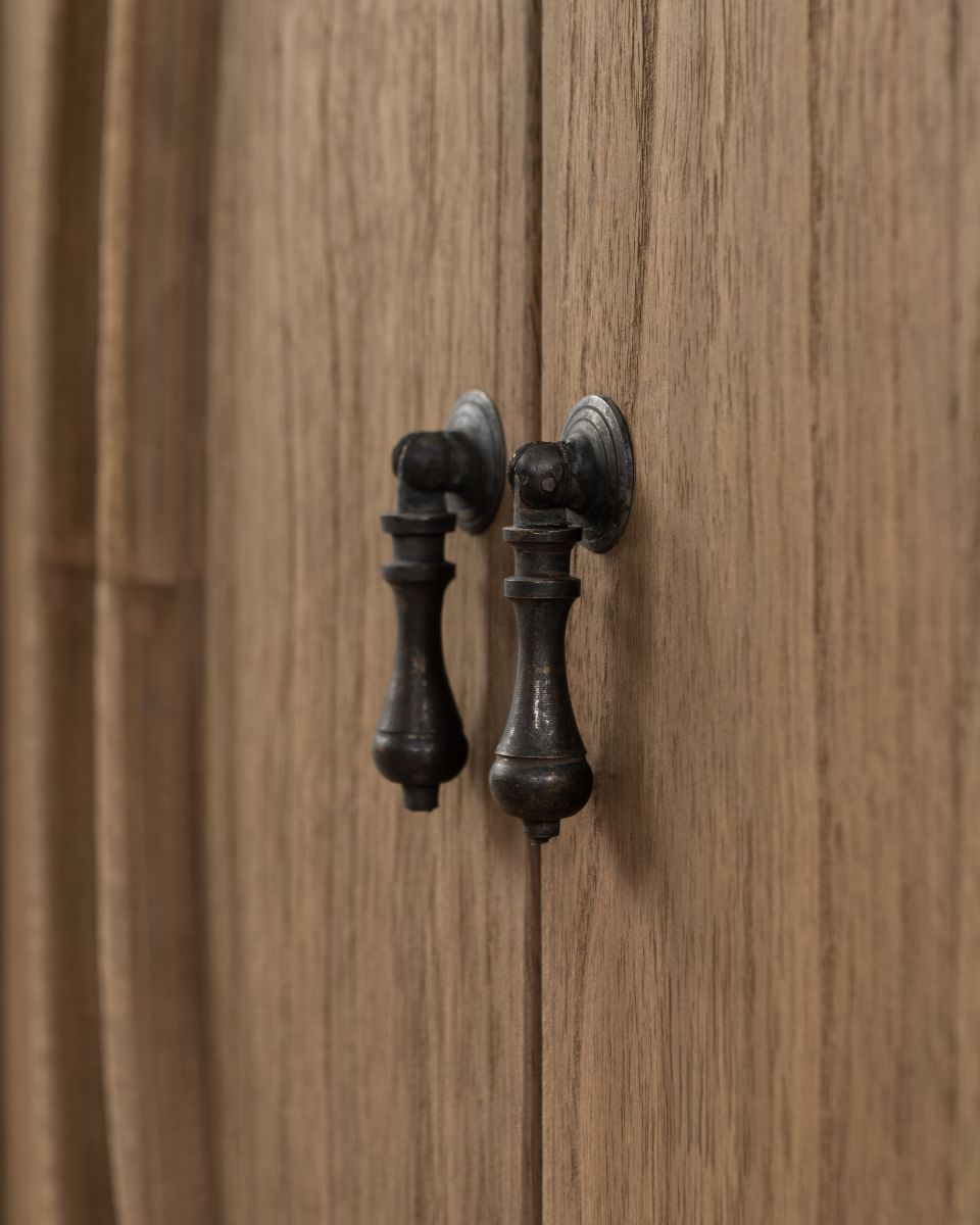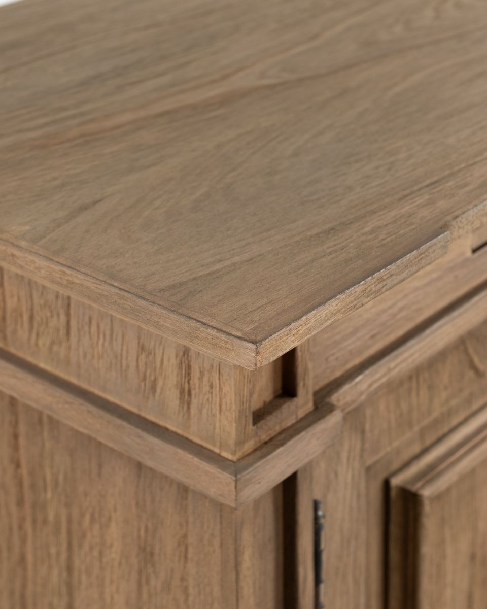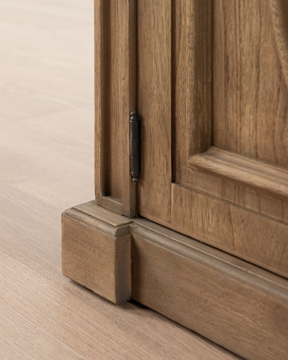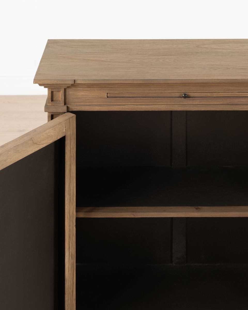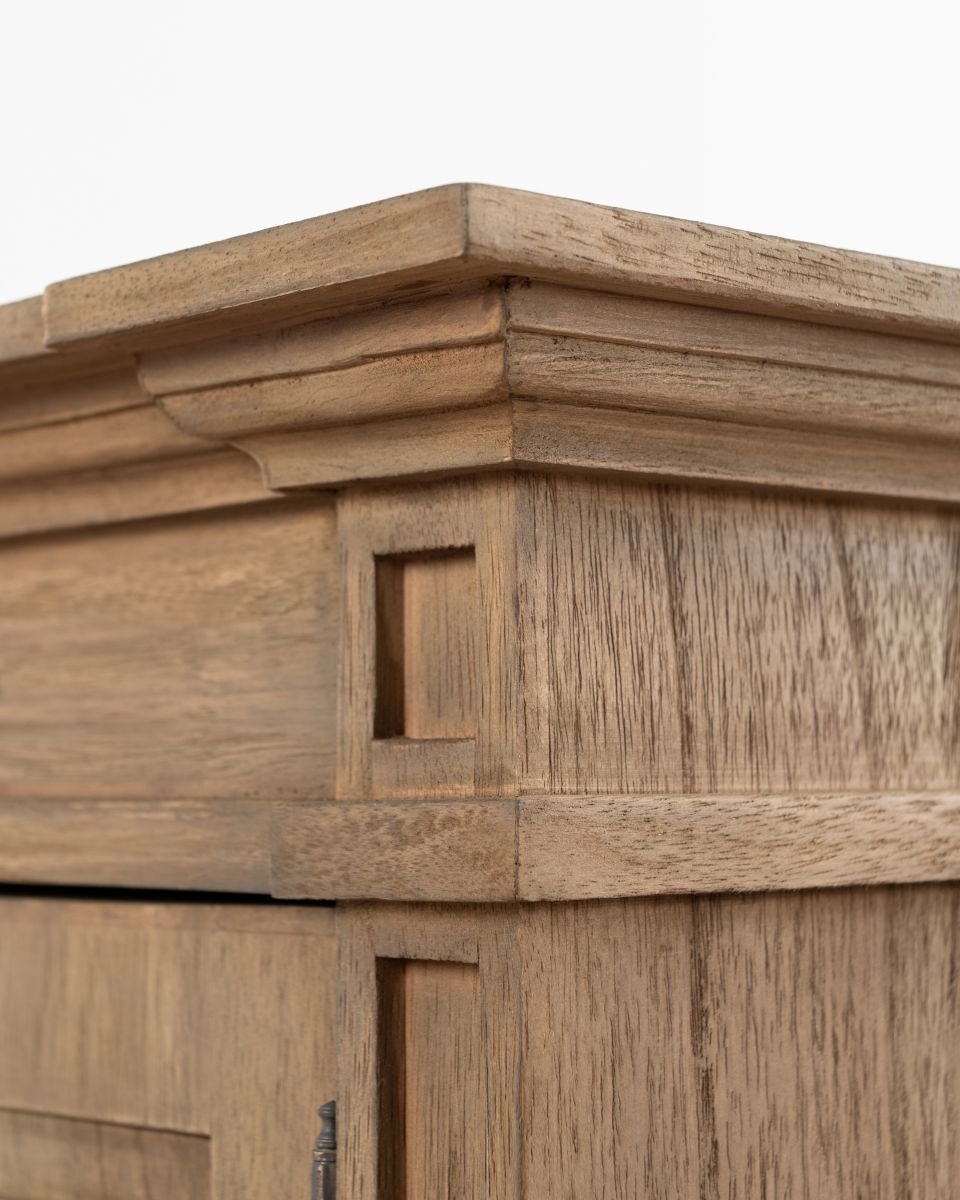 The Rennes cabinet from the Chateau collection is a lovely narrow piece brimming with classic French style. Its curved top complements the elegant wood finish of the painted base. Crafted from bayur wood with a mindi veneer, this versatile cabinet can grace either side of a fireplace with mirrors above.