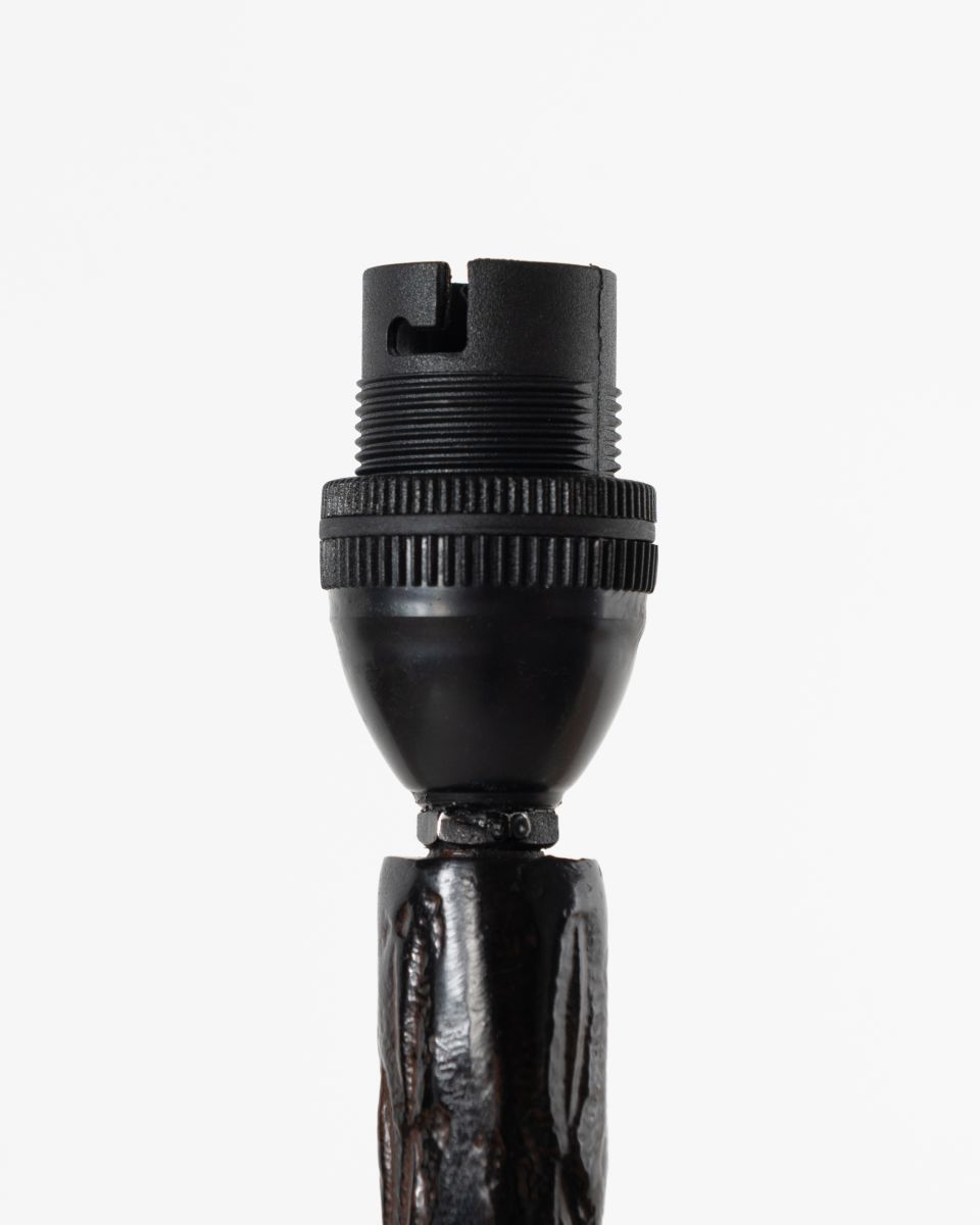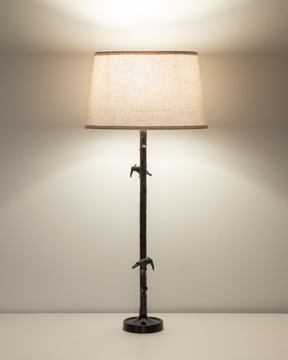 The Sanctuary Lamp Base is crafted from metal and features a slender, textured design resembling a tree branch, adorned with two sculpted perched birds. Finished in glossy black, it offers a unique blend of natural charm and modern simplicity that pairs well with a wide variety of interior styles. Designed to fit bayonet bulbs, we recommend pairing it with a neutral lamp shade.