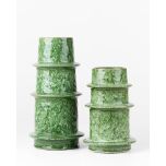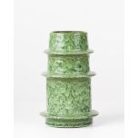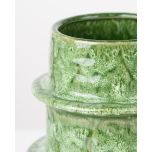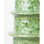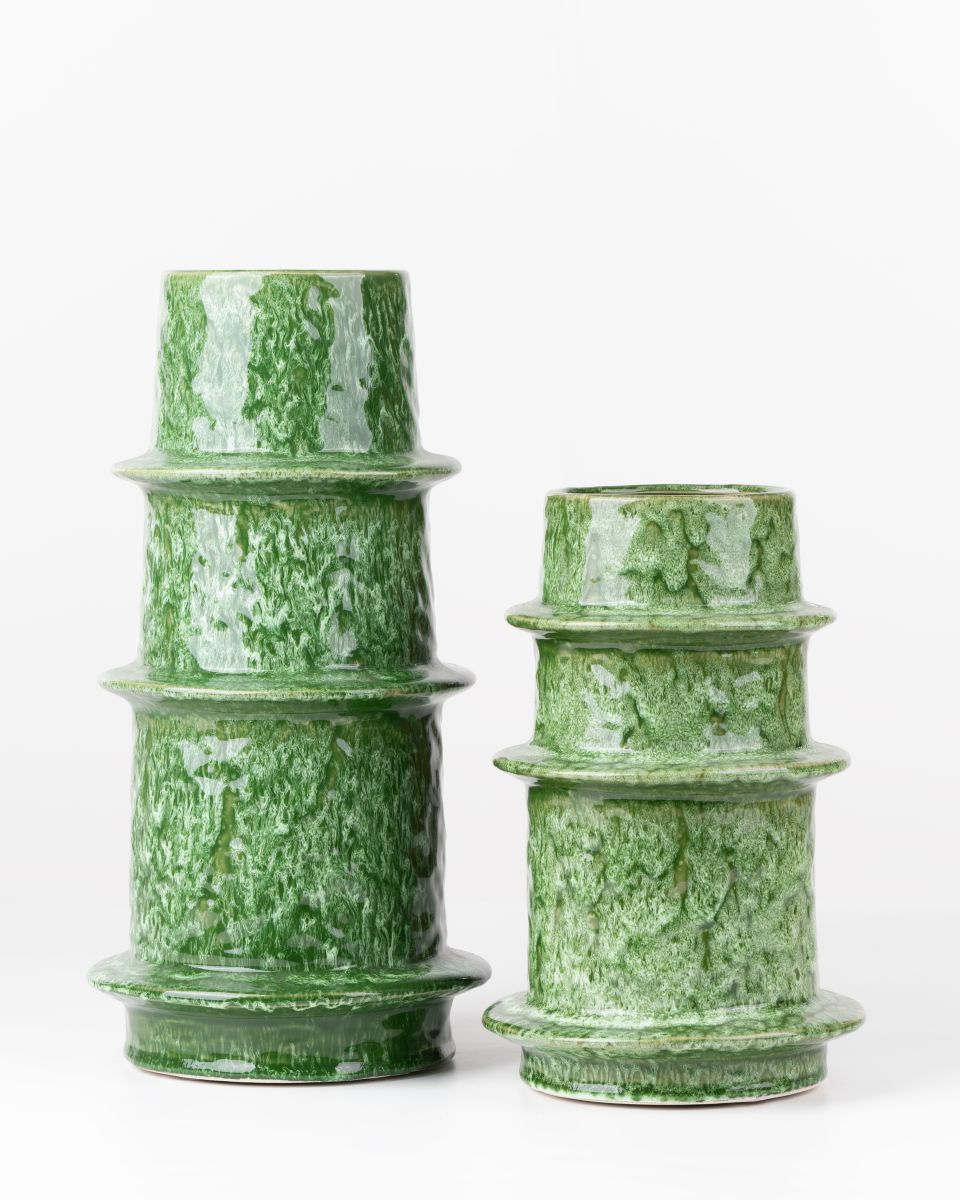 An architectural and elegant piece, the Saturn Ceramic Vessel features tiered ridges giving it a strong geometric form. Finished in a rich, mottled, emerald-green glaze for depth, it offers depth and sophistication with an artisanal quality. A versatile piece, it complements a variety of interior styles and works well in different rooms.