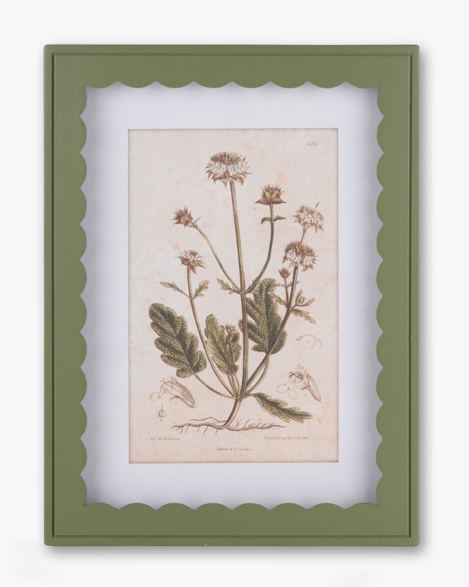Classic botanical elegance meets modern framing in the Scalloped Botanical Wall Art. Showcasing a beautifully detailed vintage-style botanical print, this piece captures the charm of traditional botanical studies while feeling fresh and current. The artwork is set within a scalloped-edge frame finished in a soft olive green, adding a touch of character and depth that complements a wide range of interior styles.