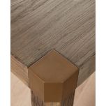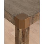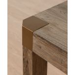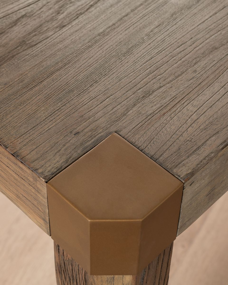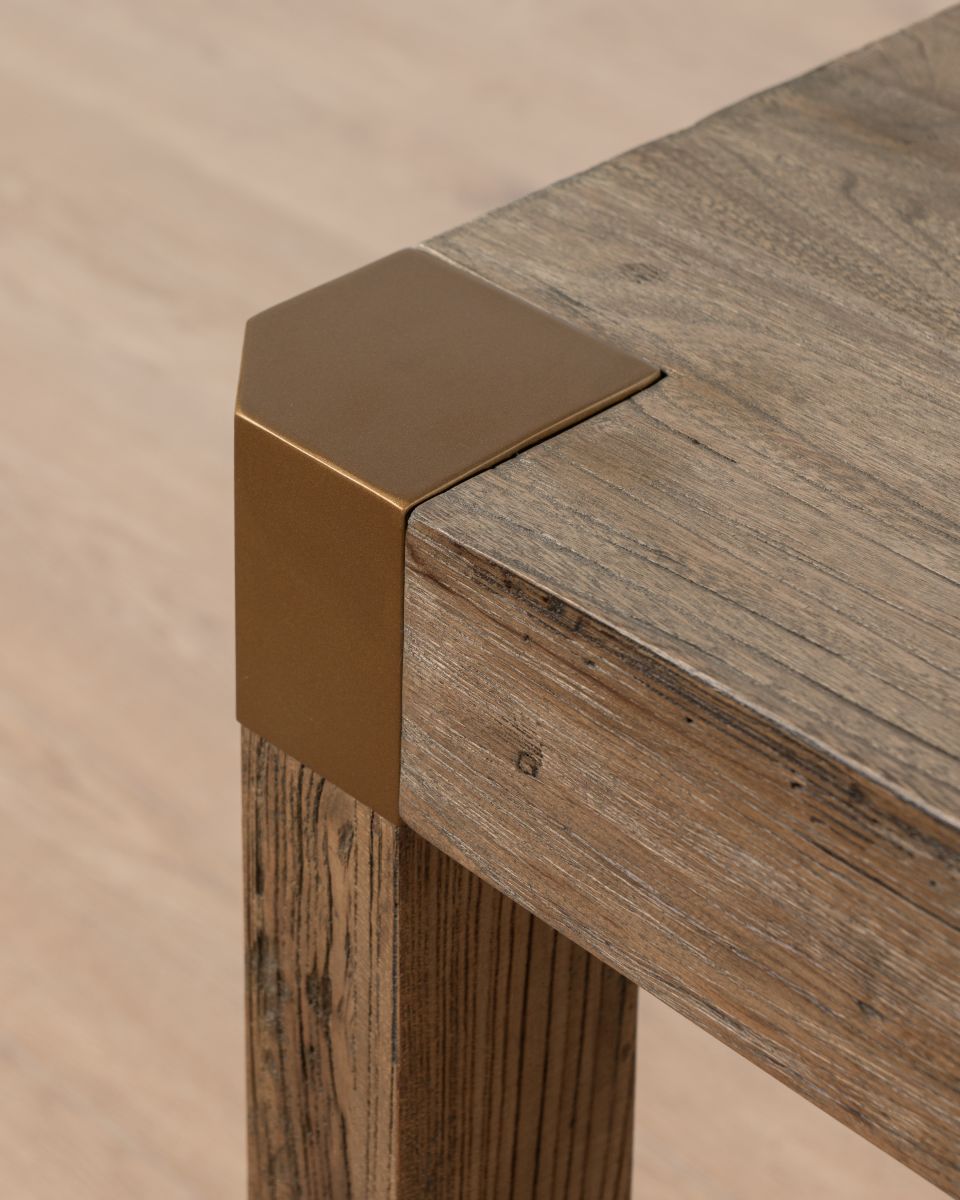 - Brass corner detailing adds a modern touch and refinement that contrasts with the table’s rustic charm