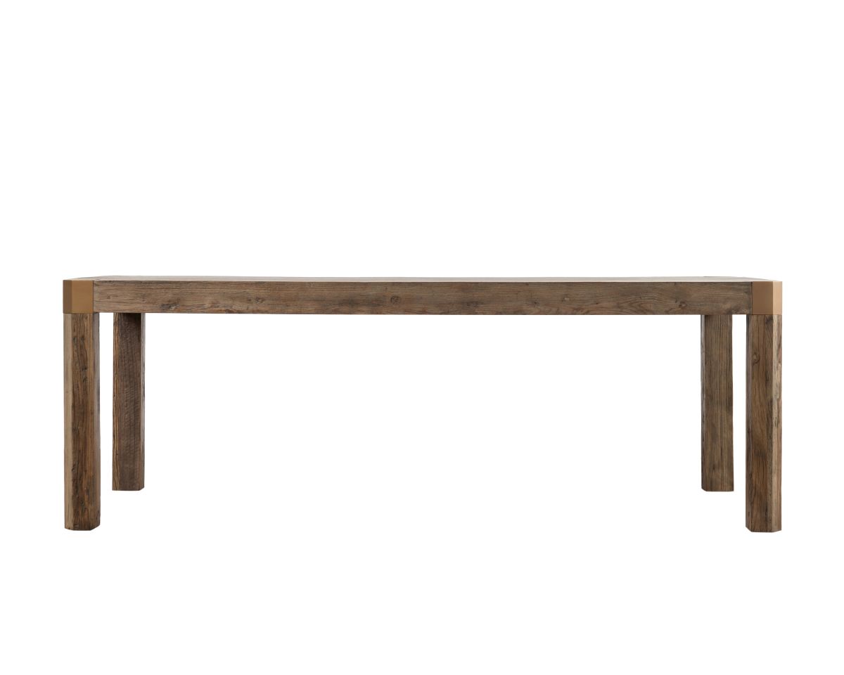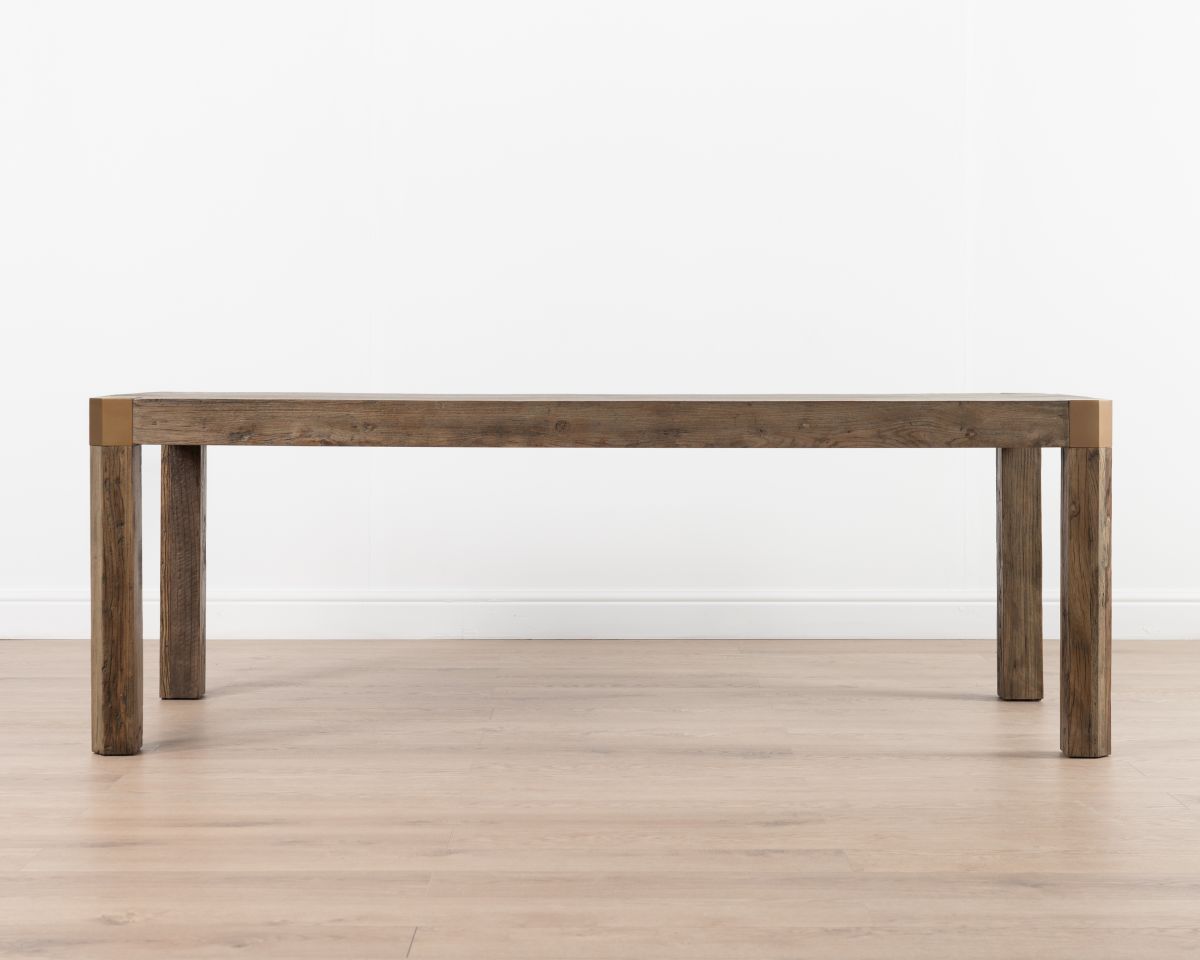 The Serengeti Dinner Table from our Ebony Collection effortlessly blends modern organic elegance and natural character. Crafted from reclaimed elm wood, each table features unique textures, knots, and grain patterns, telling the story of wood's past life. Its sturdy, minimalist silhouette is adorned with brass corner detailing, adding a modern touch and refinement that contrasts with the table’s rustic charm. Perfectly proportioned, the Serengeti Dinner Table is a versatile piece that's ideal for both casual family meals and formal entertaining.