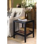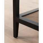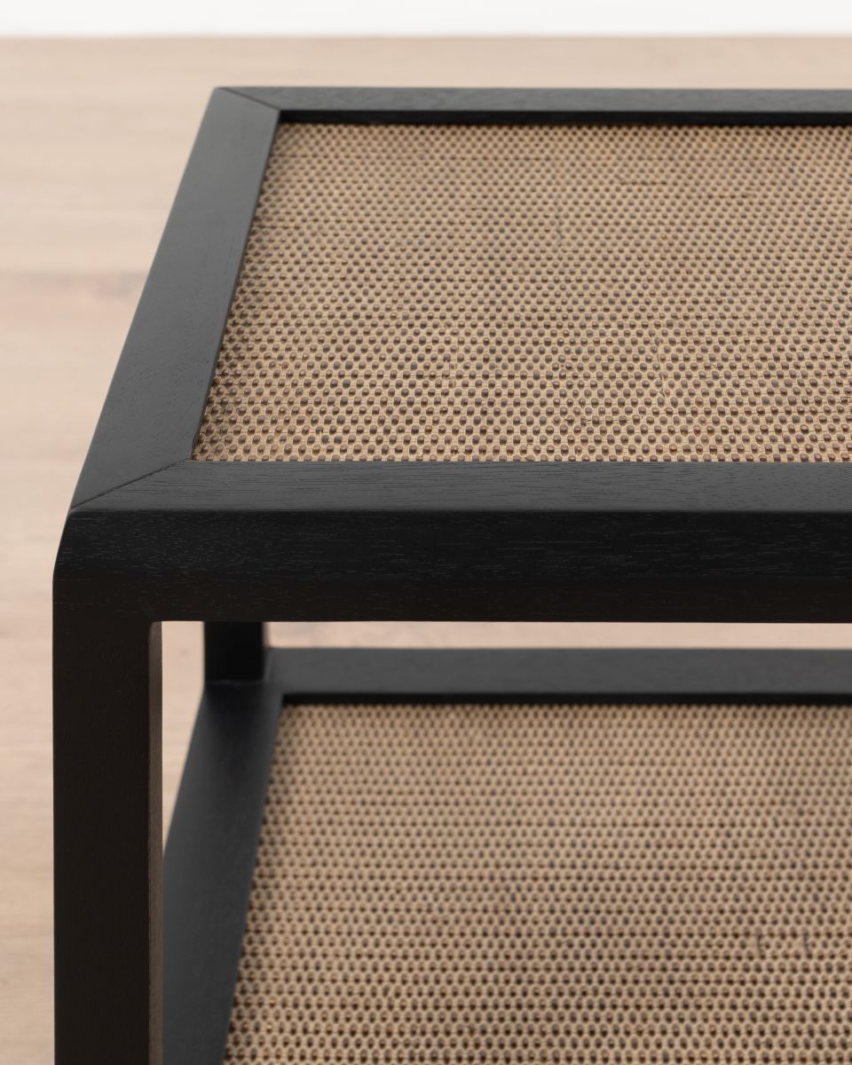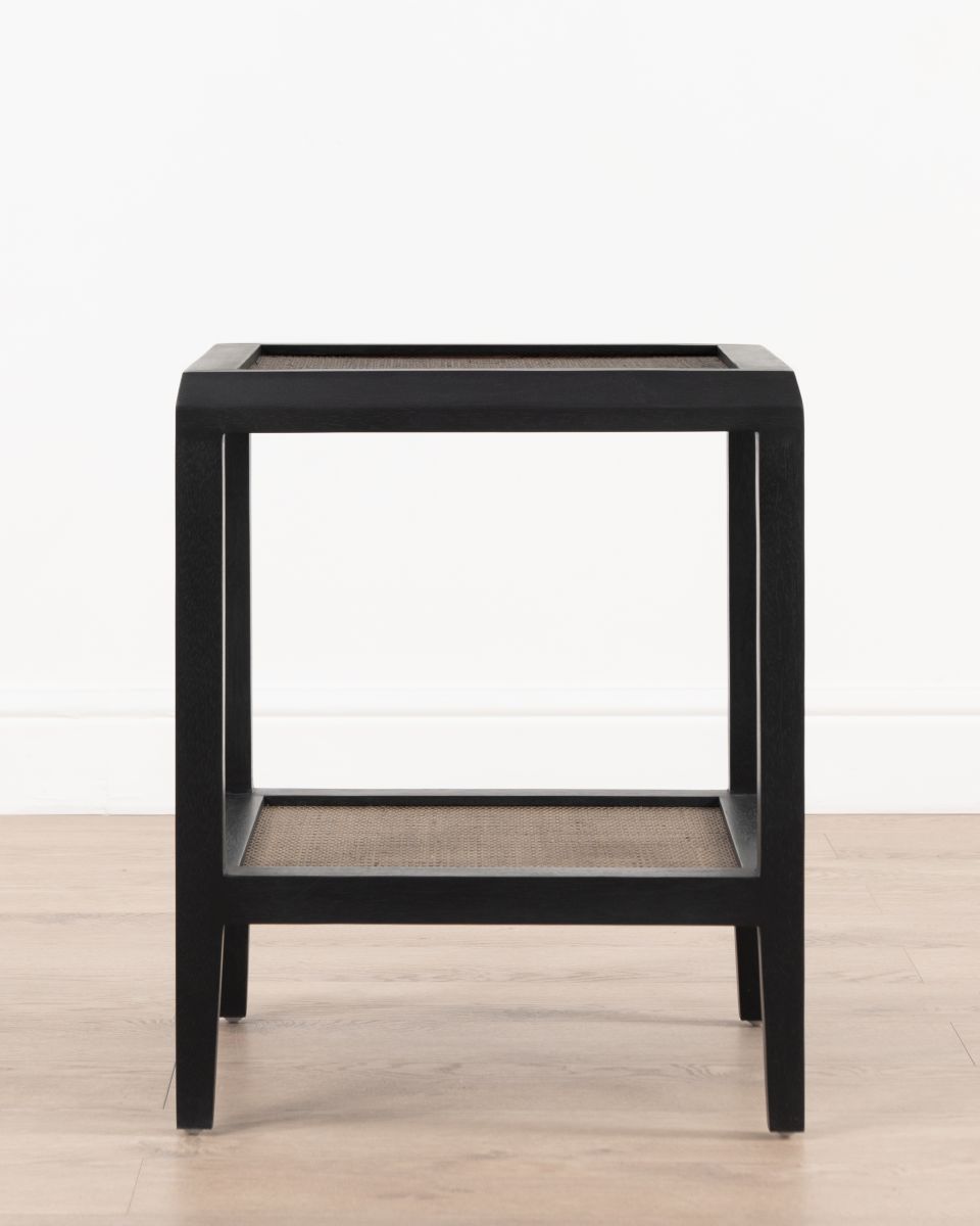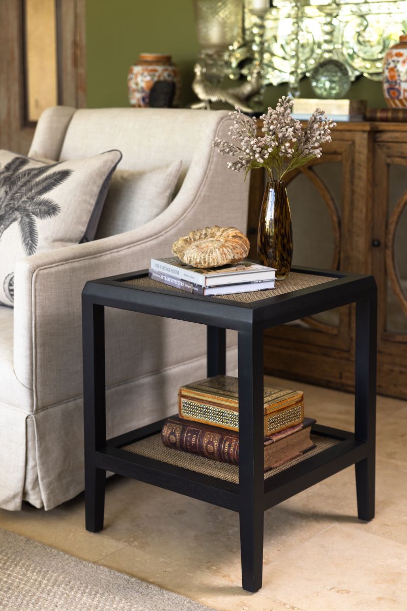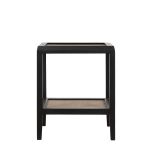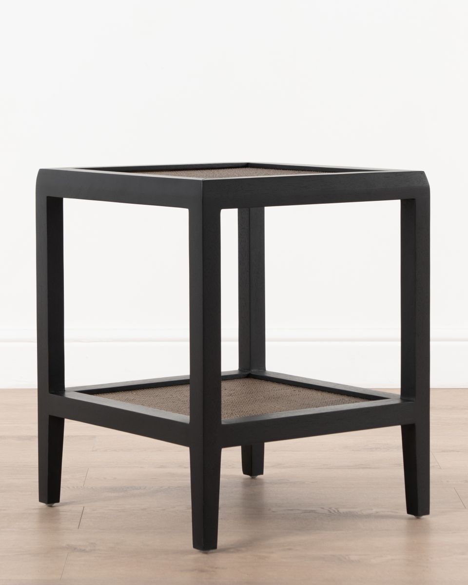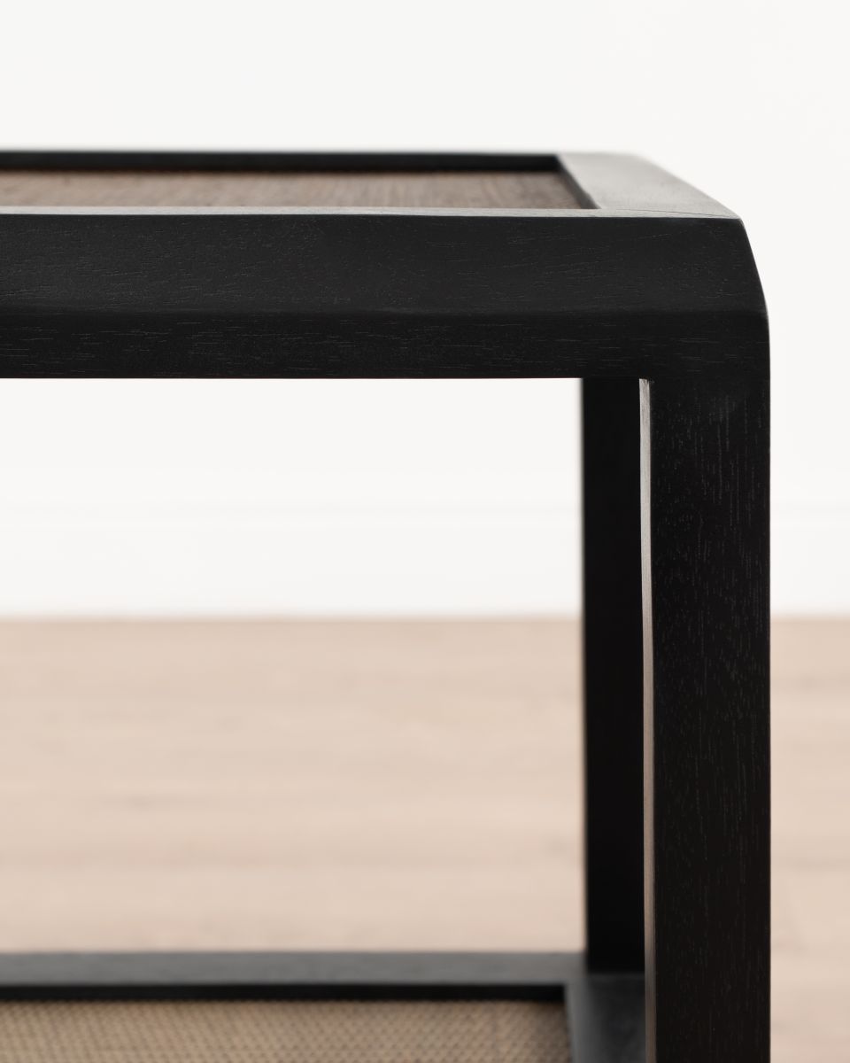 The Palm side table from the Villa collection blends a modern and classic aesthetic, showcasing a striking contrast between black wood and warm brown cane inserts. Made from sturdy bayur wood, the top features a natural rattan inlay, adding texture and intrigue, while the lower shelf offers ample space for stacking books or displaying decor pieces. Its square shape and thoughtful details make it an ideal complement to your living room decor. Pair it with neutral furnishings and a few potted plants to highlight its organic features.