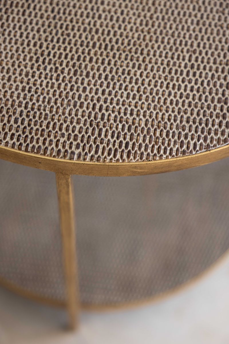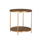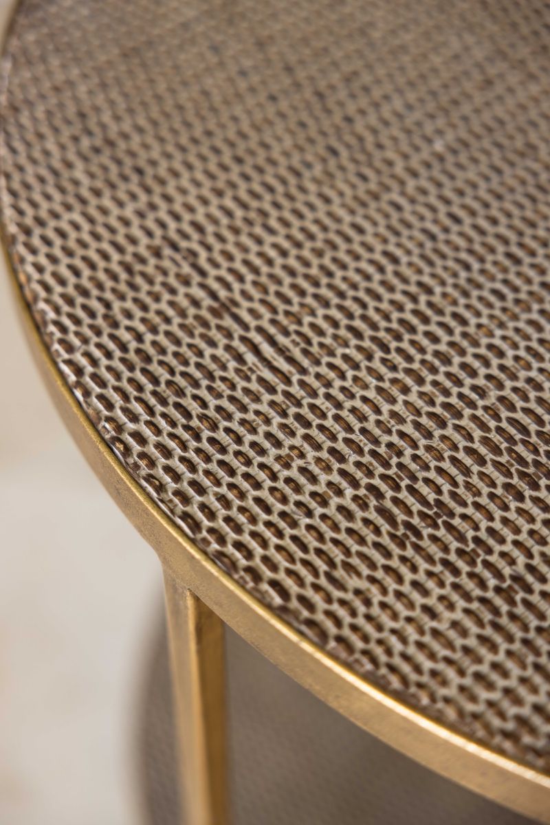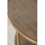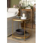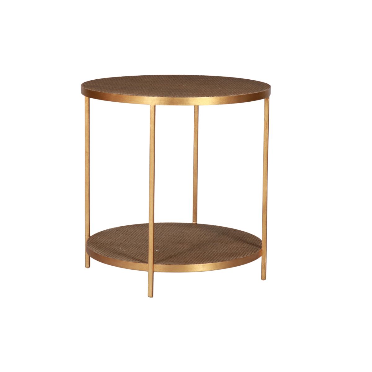 The Sardinia round side table from the Villa collection is constructed with a metal frame, offering stability and durability while the rattan inlay on the bottom shelf introduces natural texture. Position this side table next to a neutral-toned sofa and adorn it with a statement lamp to highlight its gold accents. Complete the look with a few indoor plants nearby to enhance its natural charm.