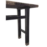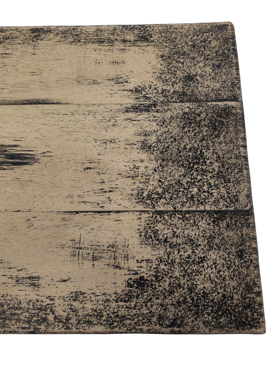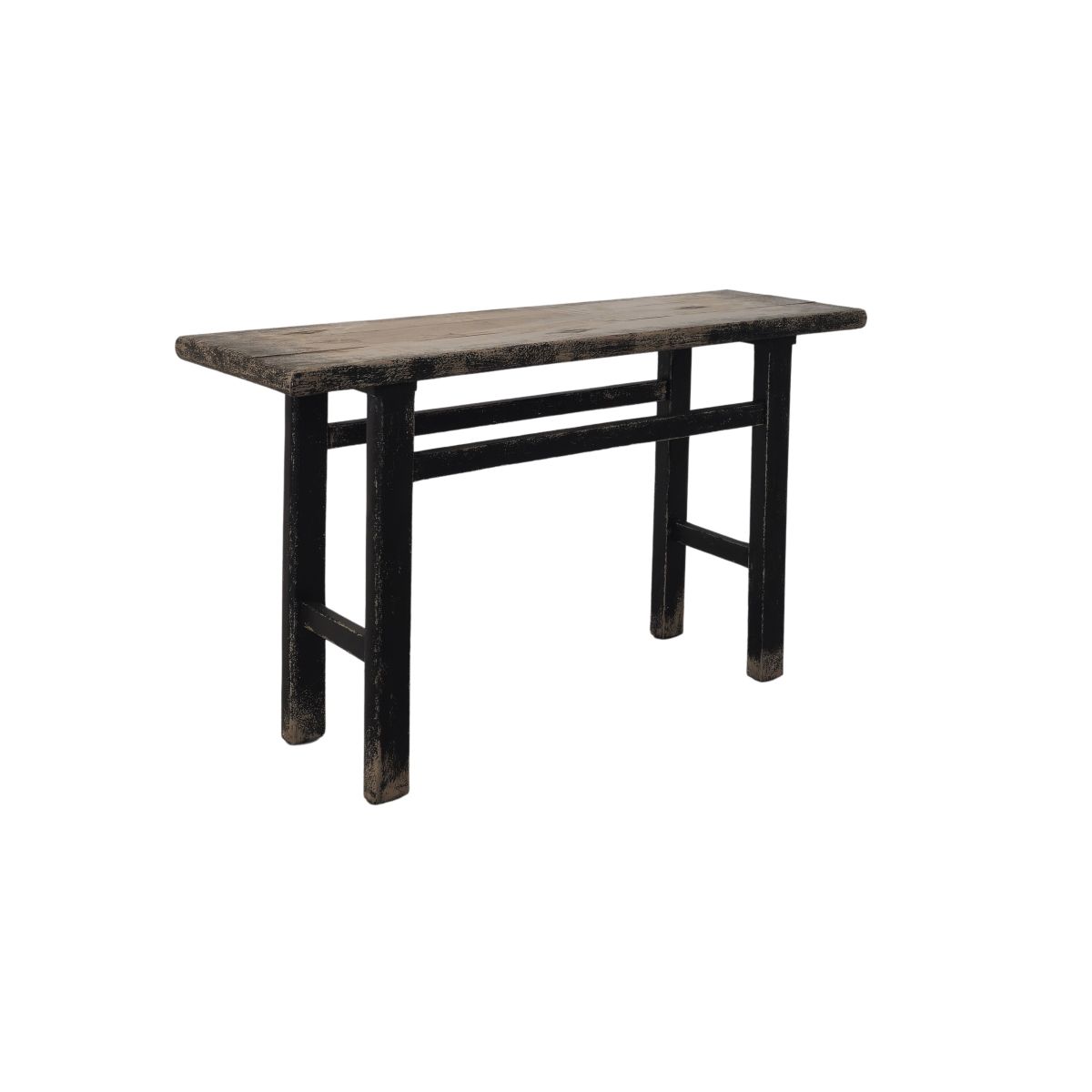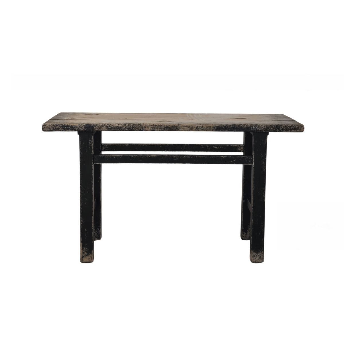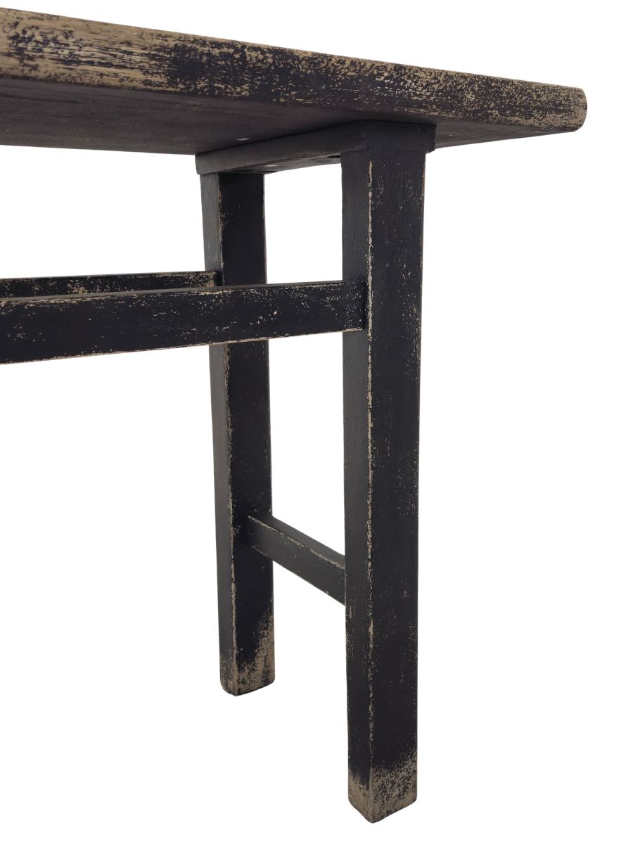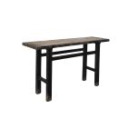 - Features a rectangular top with a weathered finish, supported by thick, rectangular legs connected by a crossbar