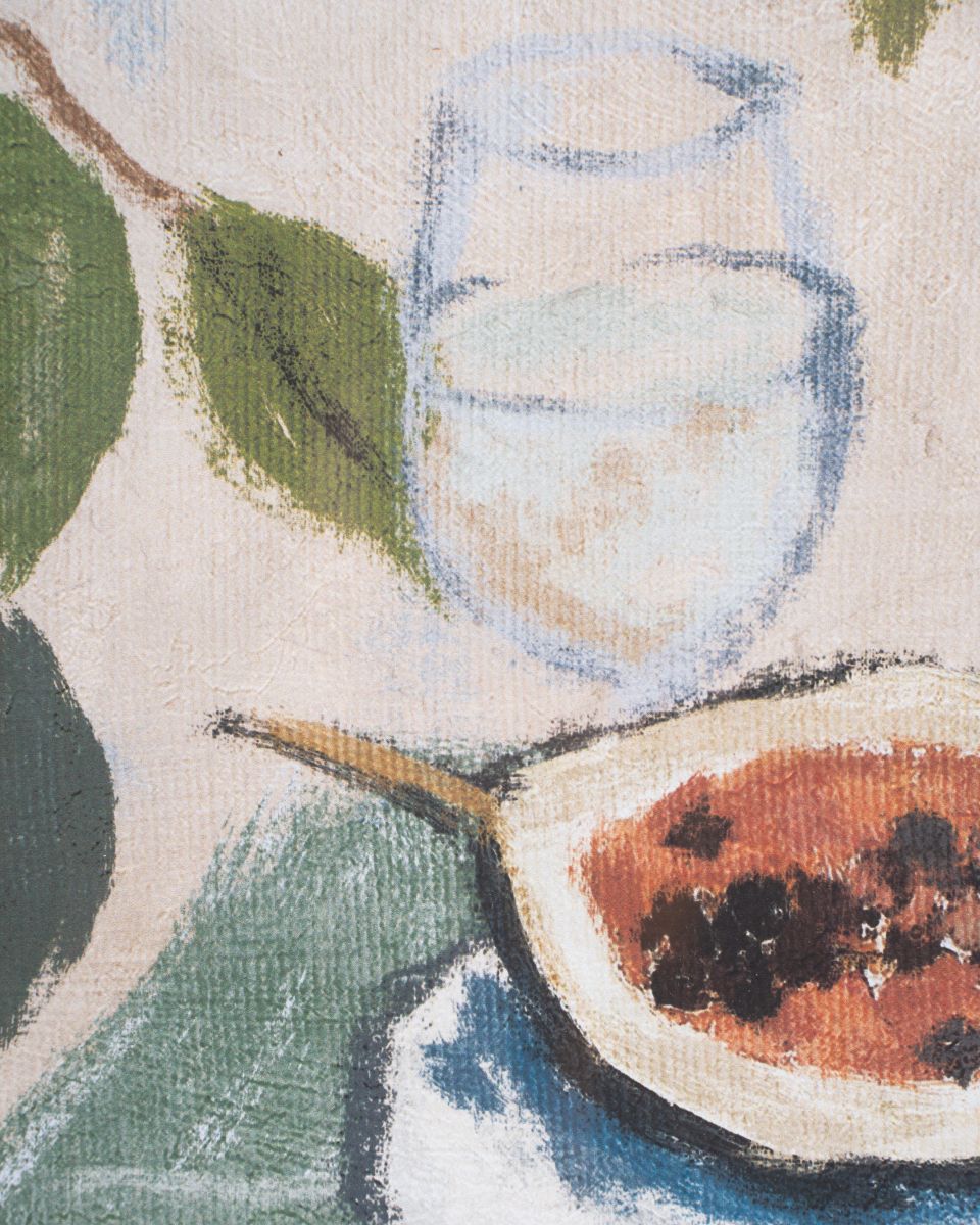 - Features a plate of ripe figs, a glass of water and cascading greenery in earthy tones and expressive brushstrokes