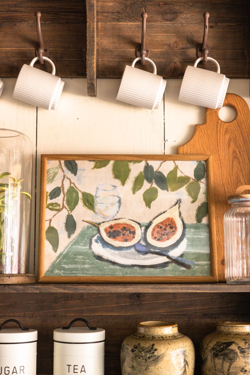 Add a touch of rustic charm and artistic flair to your walls with the Still Life Framed Wall Art. Earthy tones and expressive brushstrokes bring warmth and texture to this still life of a plate of ripe figs, a glass of water and cascading greenery. Complete with a wooden frame in a natural finish, it's a relaxed, elegant piece that works wonderfully as a standalone piece or as part of a curated gallery wall. Ideal for kitchens, dining spaces, or cosy nooks.