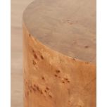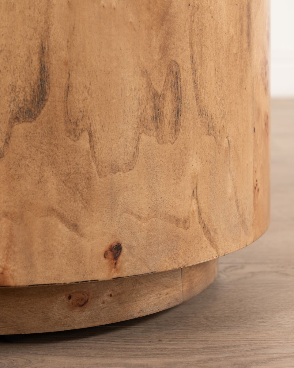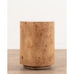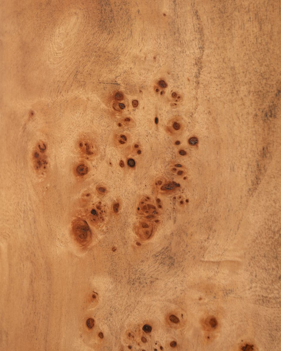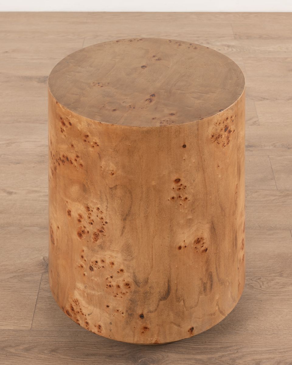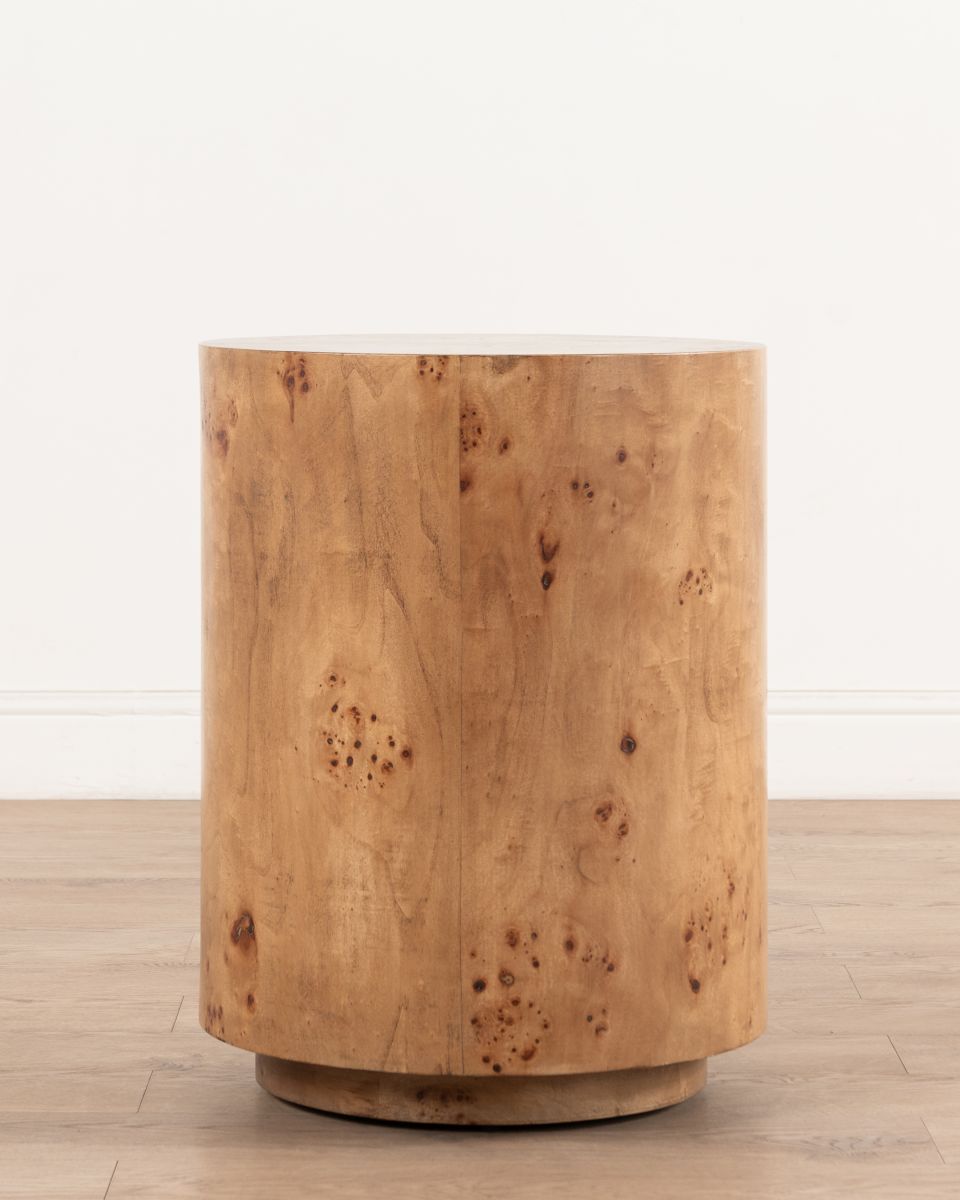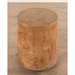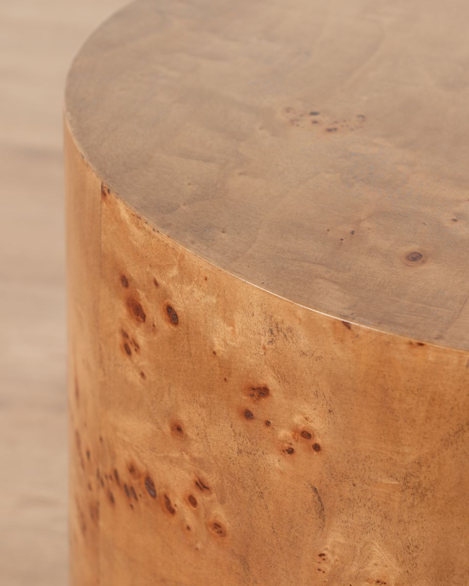 The Sunbark Stool celebrates the natural character of golden madrone burl wood, with its warm tones and expressive grain taking centre stage. The solid cylindrical form keeps the silhouette clean and sculptural, allowing the material to do the talking.
