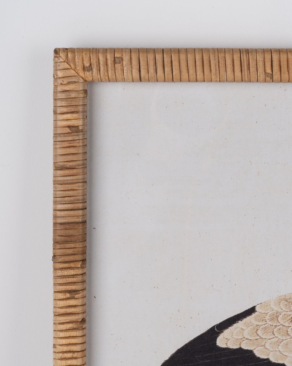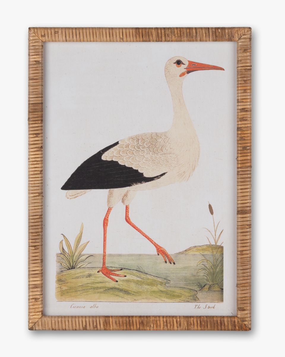 Invite a sense of calm and natural elegance into your home with the Stork Wall Art. Featuring a majestic white stork, rendered in a classic style, it's completed with a beautifully textured, natural rattan frame, exuding an organic charm that perfectly complements the timeless subject.