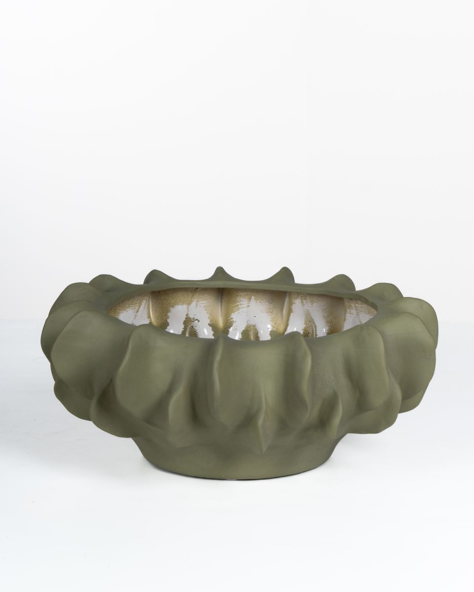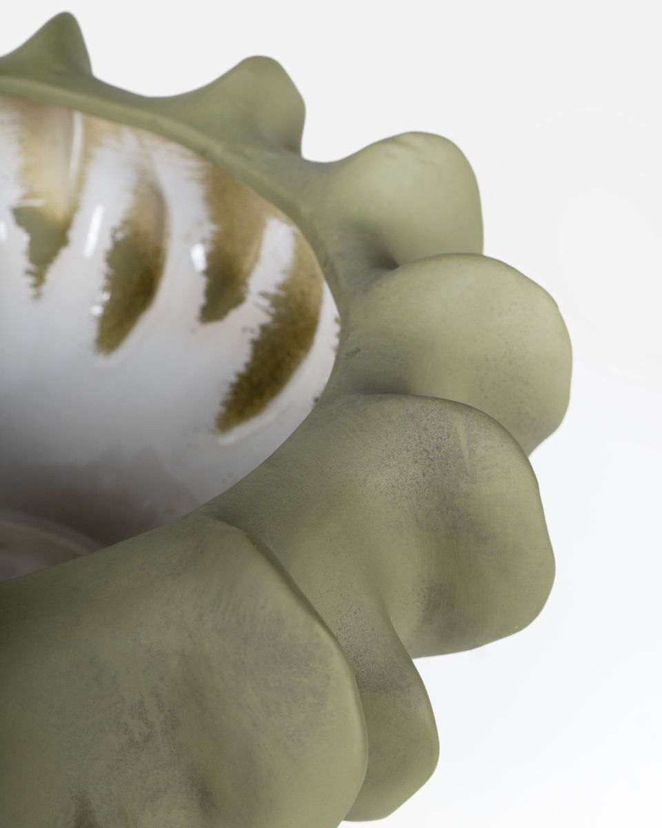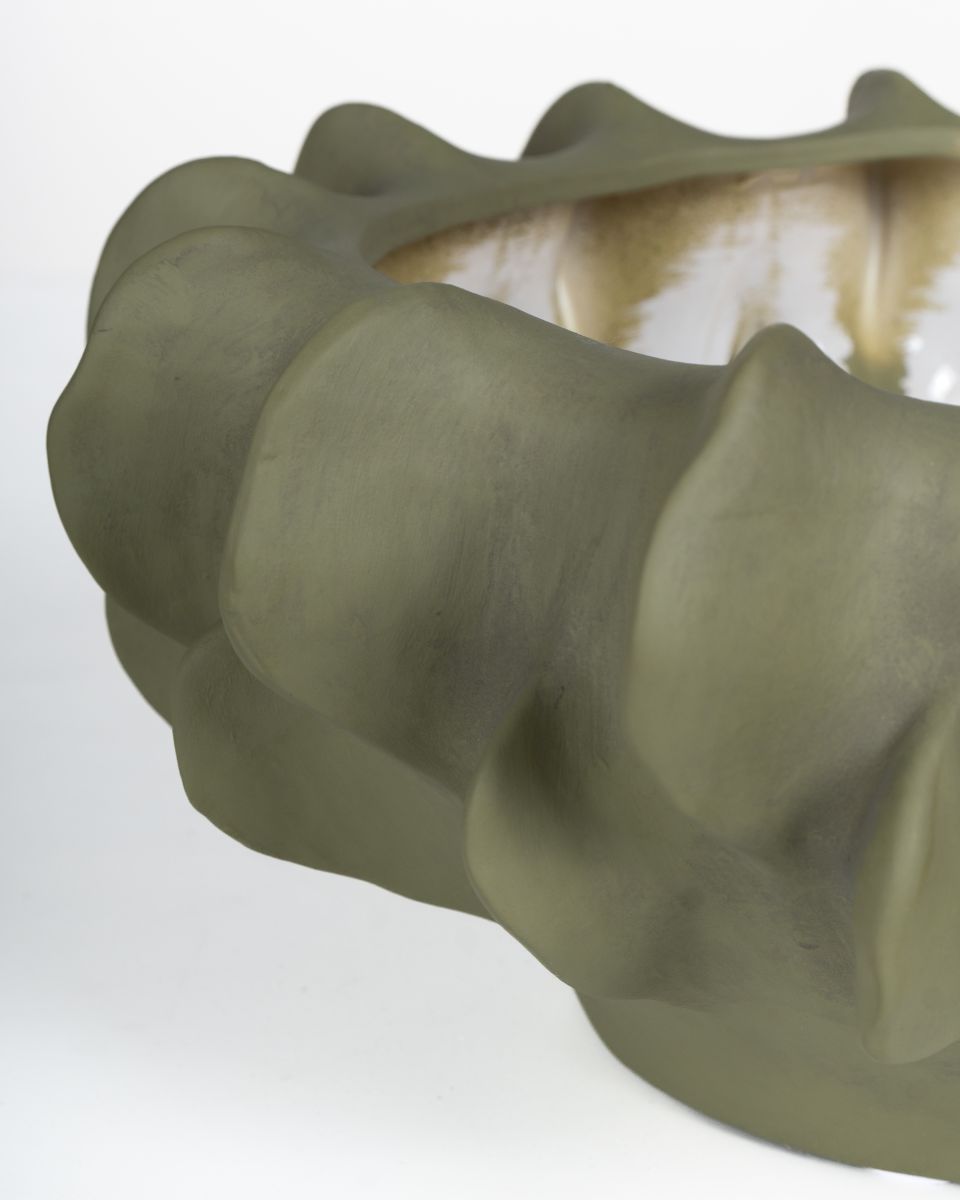 An elegant fusion of organic form and contemporary refinement, the Suede Ceramic Bowl features gently ruffled detailing. Finished in a velvety, matte olive-green glaze, it's a masterpiece of understated beauty. Organic, tactile and modern, it's a versatile piece that's ideal as a centrepiece, fruit bowl, or sculptural accent.