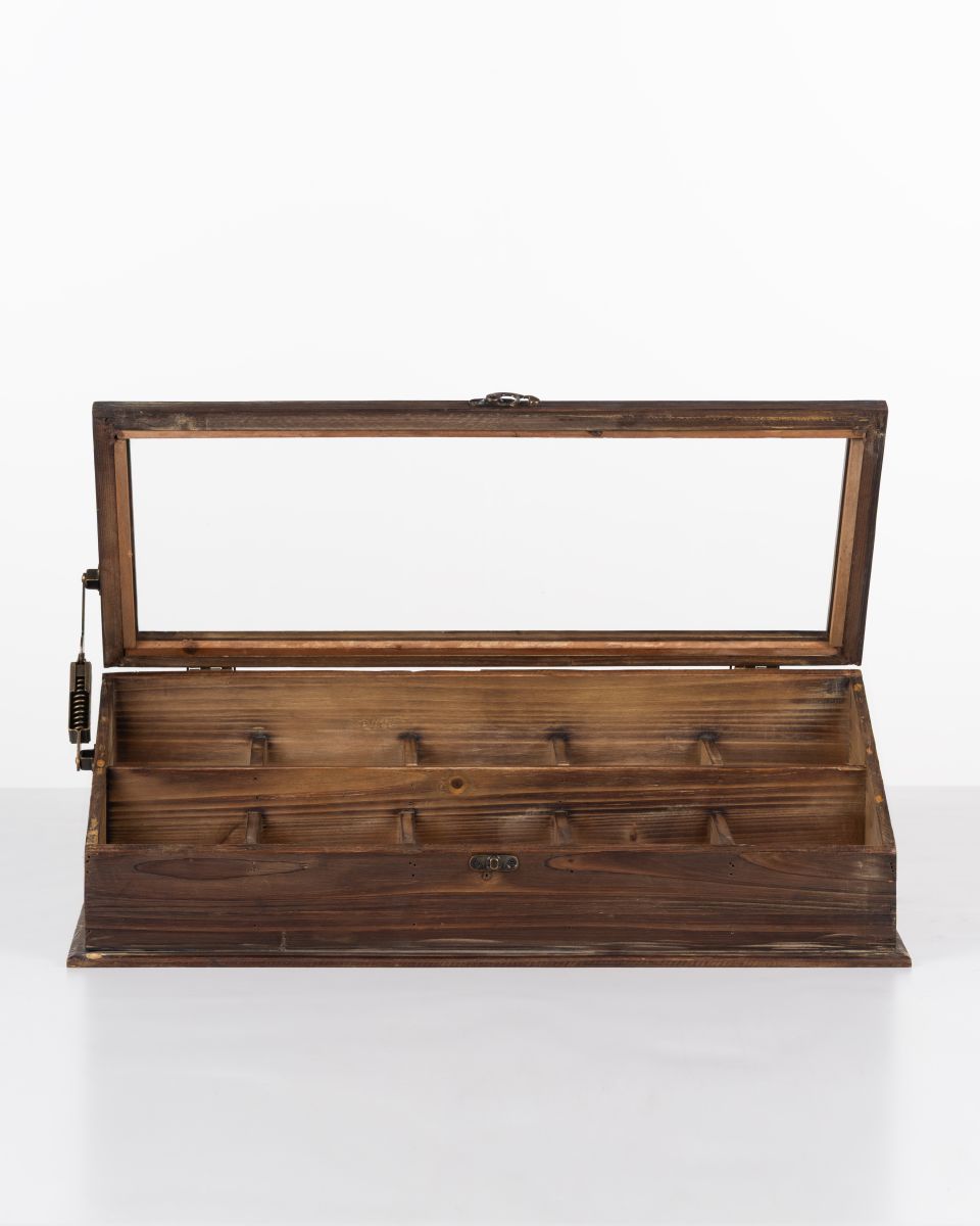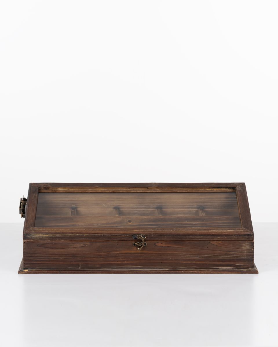 Its hinged top and brass-finished latch add both character and functionality, while the slanted frame and rustic finish evoke the handcrafted charm of vintage greenhouse displays. Perfect for use on consoles, sideboards, or countertops, the Terrarium Display Chest brings organic warmth and artisanal elegance to any home interior.