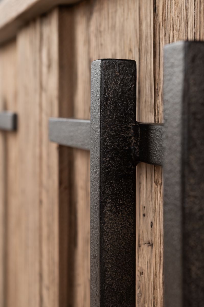 - Crafted from reclaimed oak with iron accents