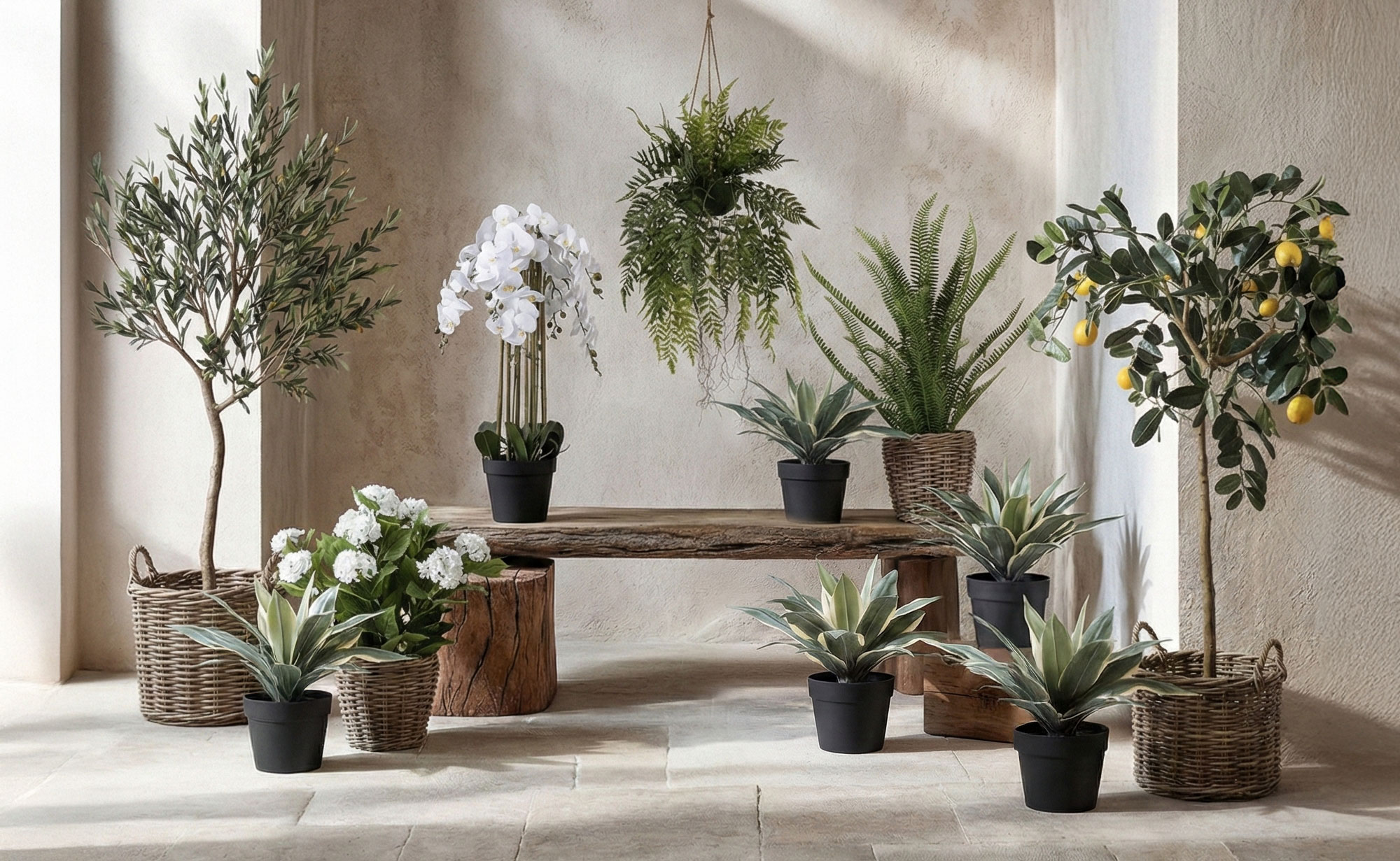 Our faux plants are crafted from durable synthetic materials and designed for lifelike texture and form. A bold, low-maintenance way to bring natural character into your space. Style them on consoles, shelves or in oversized planters to soften hard edges and add depth without worrying about light or watering.