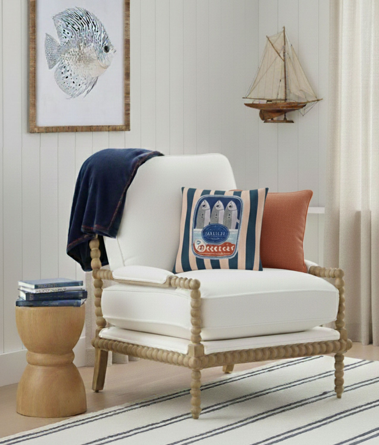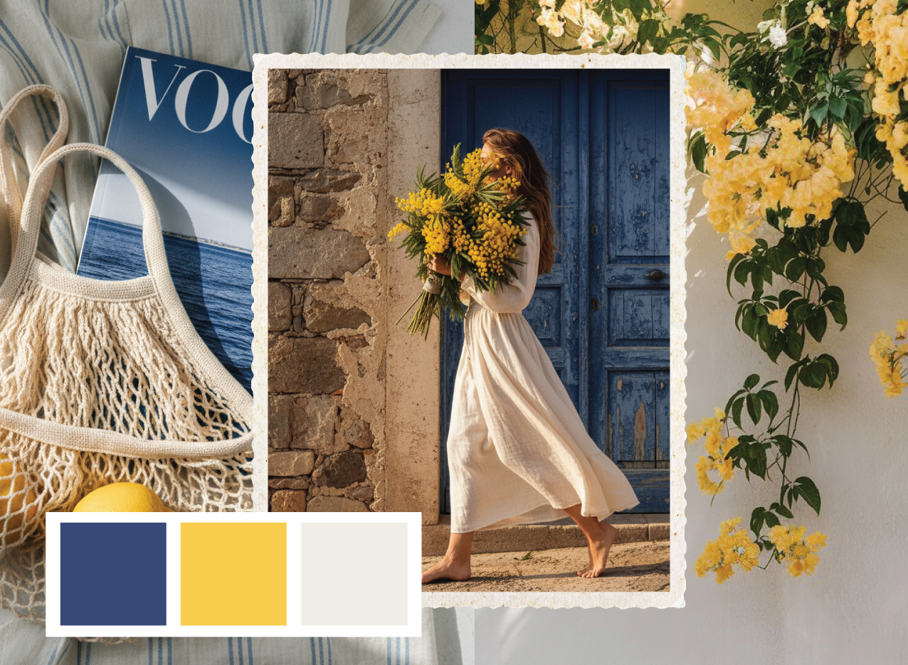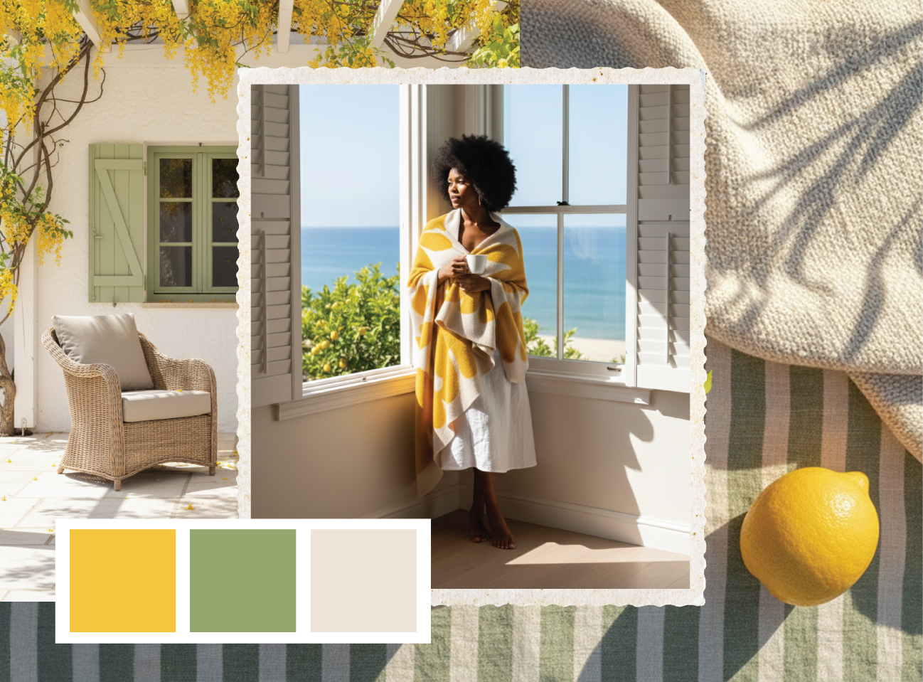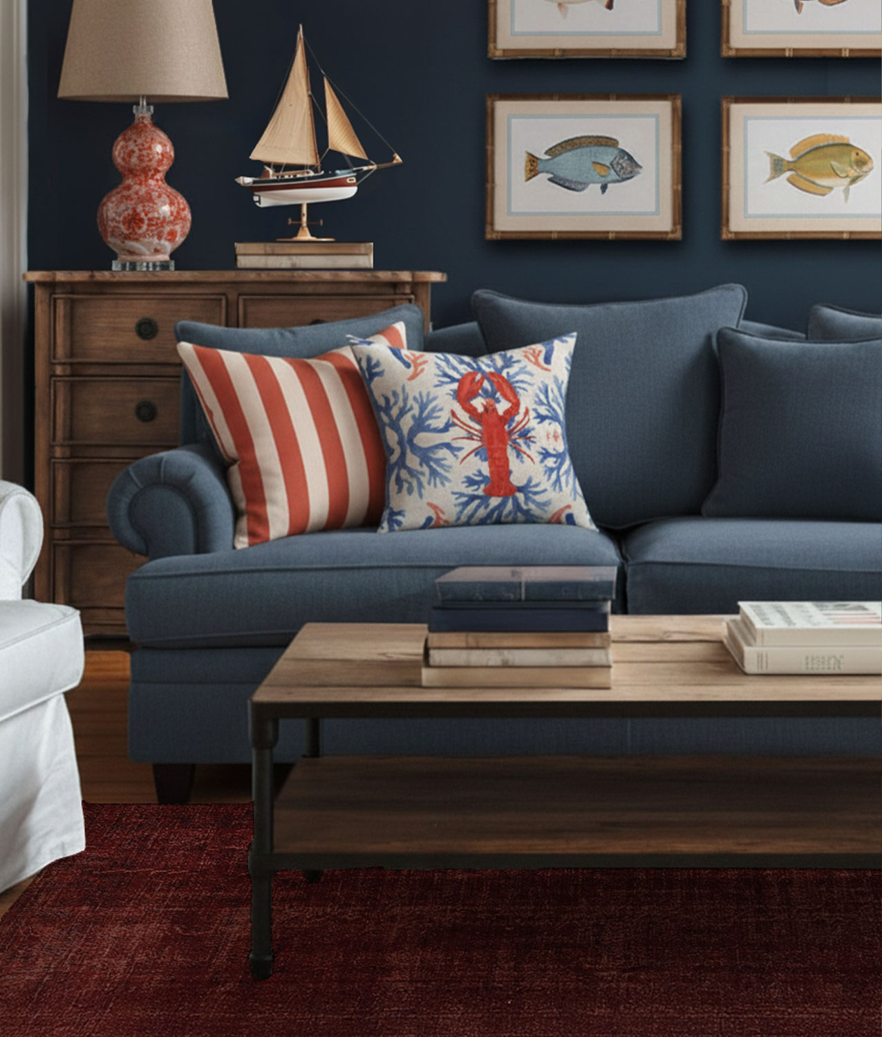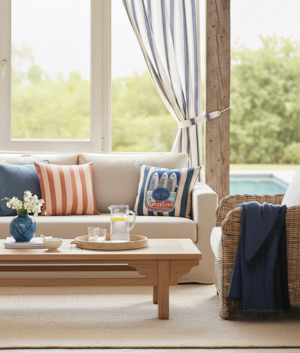 This palette blends deep ocean blues, crisp whites and warm sun-kissed reds — capturing the quiet beauty of harbour towns, classic stripes and days spent on the water. Styled through natural textures and nautical details, it brings a calm, refined coastal feel to any space.